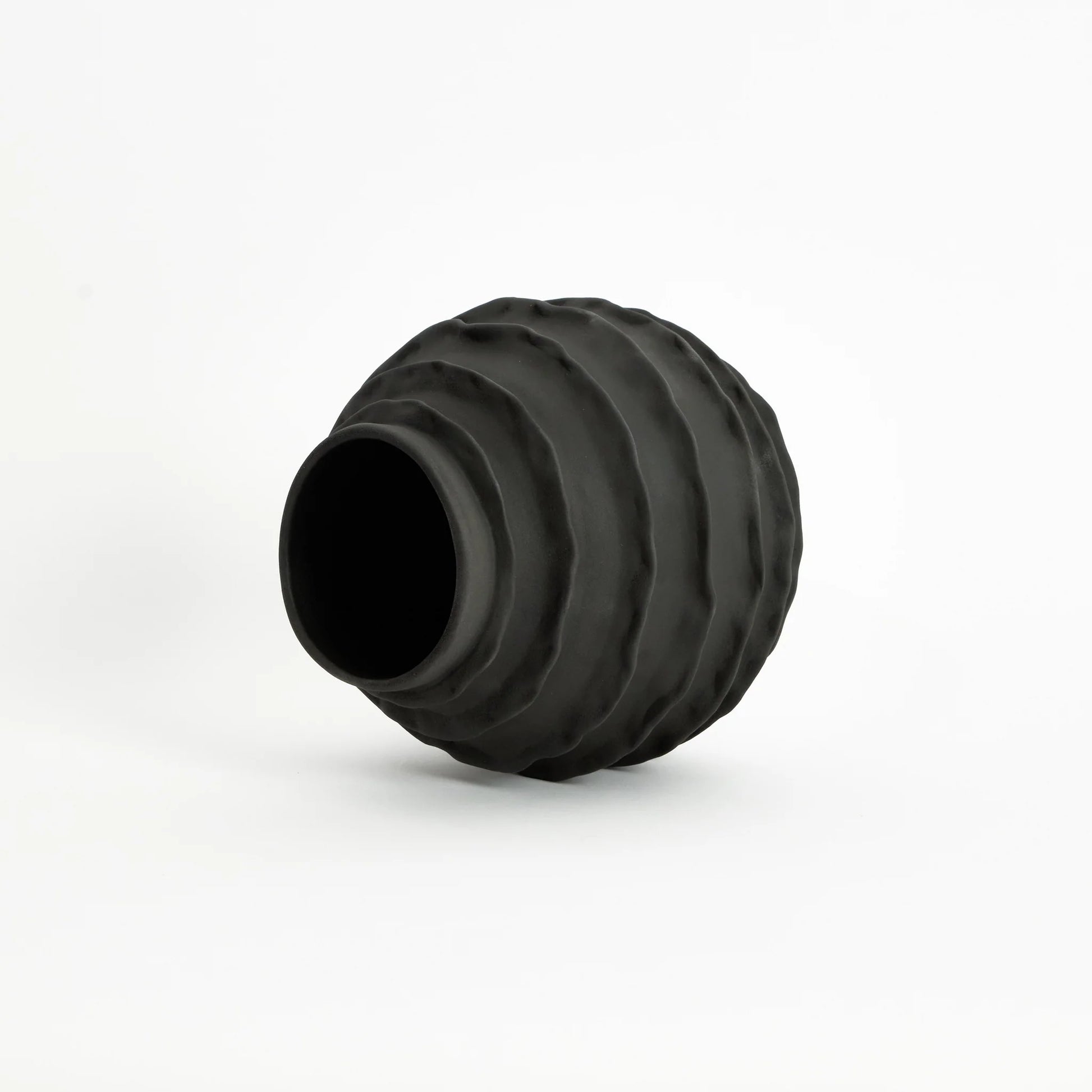 The vase is decorated with seven delicate ruffles running around the body, finished in a contemporary matt black glaze.