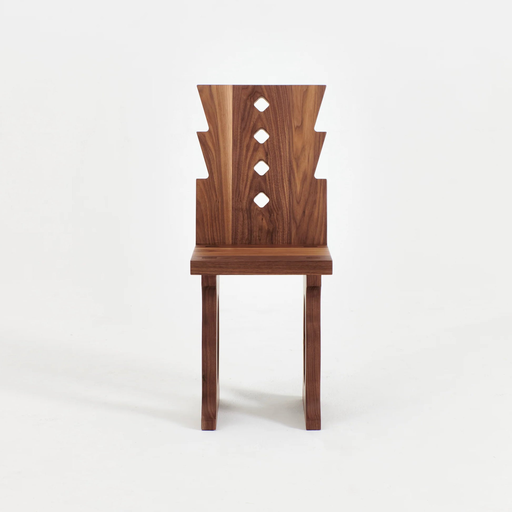 This chair is part of a series with eight different designs with a graphic shaped backrest and structural legs. Crafted from solid walnut by skilled artisans in Northern Portugal.