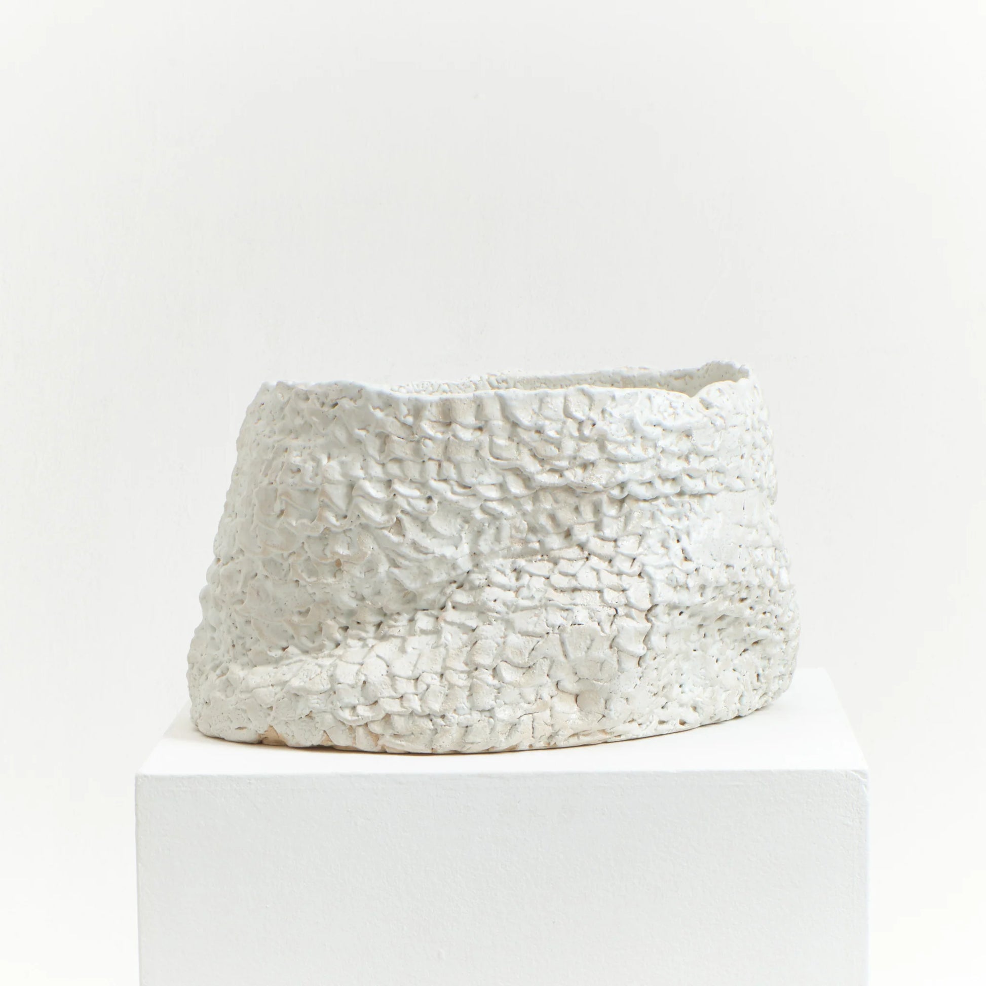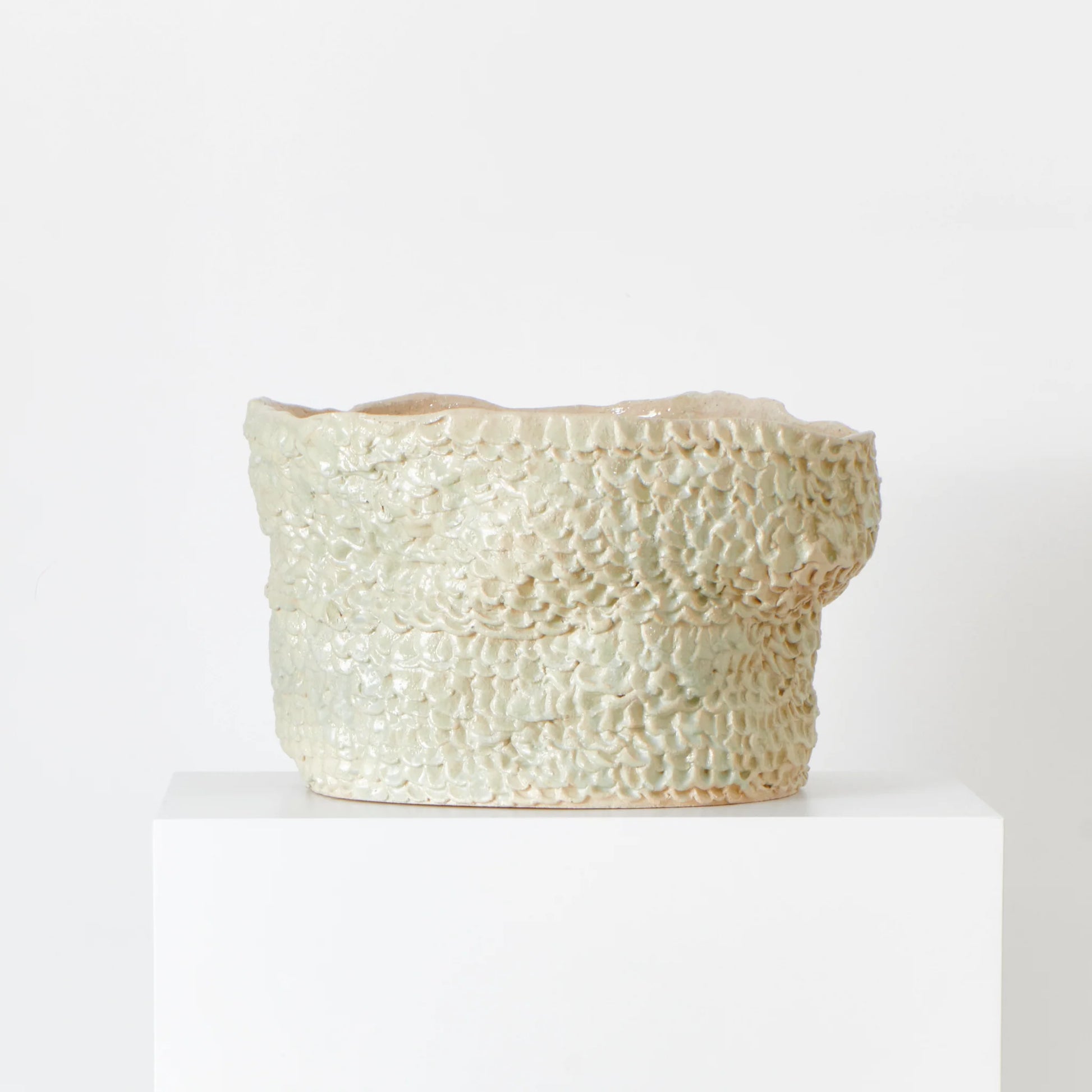 Artisanal planter created by skilled artisans in Project 213A's own workshop. Hand-sculpted ceramic with textured petal shaped finish.
