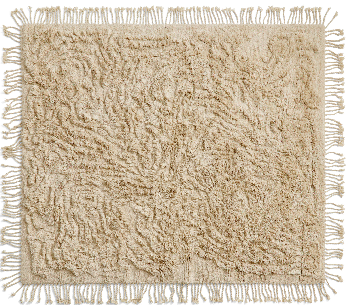 Rugs no.13 is fully hand-knotted and sports a hand cut pattern. The twisted wool fringes along all sides of the rug are a striking emphasis on its artistic expression.