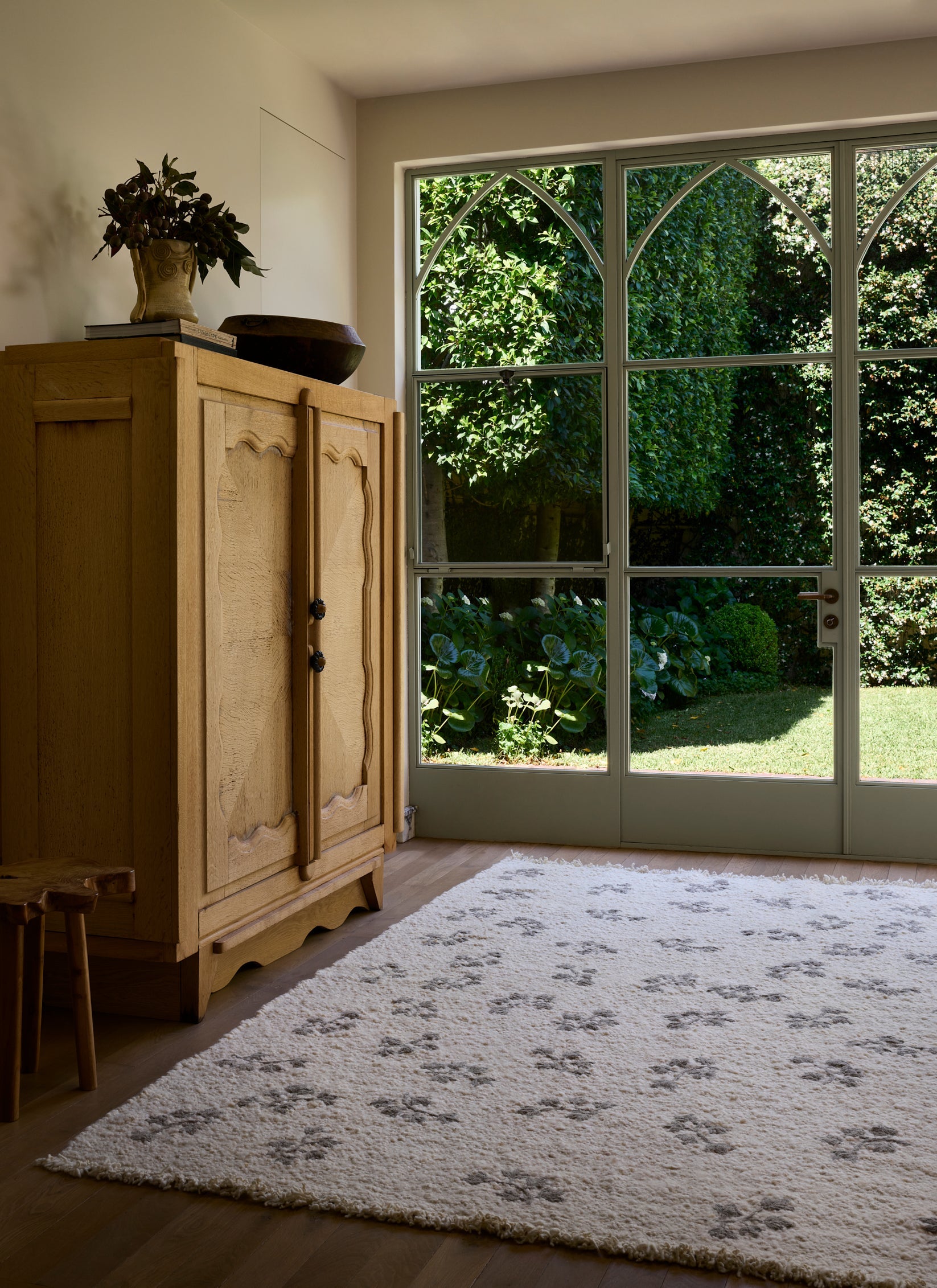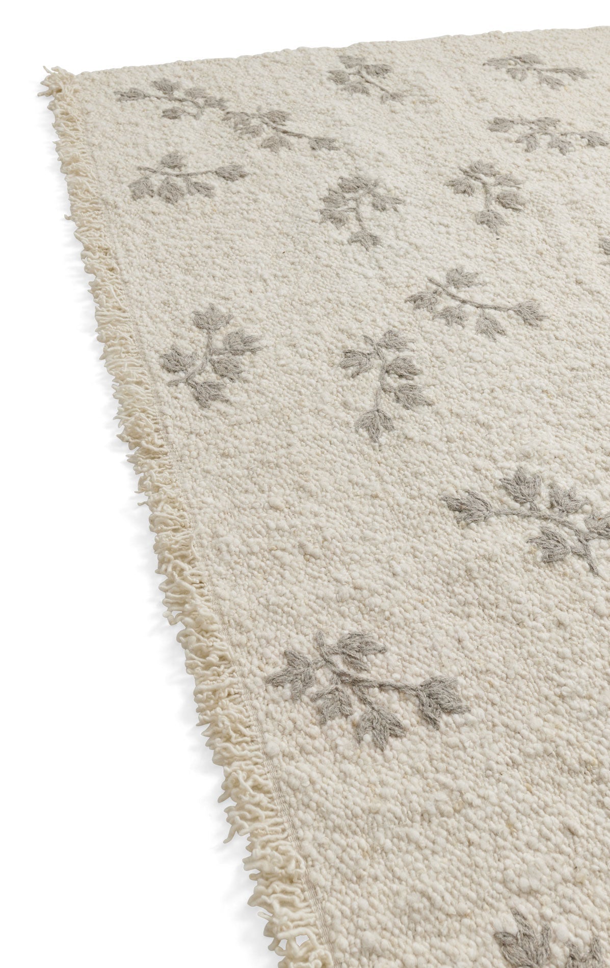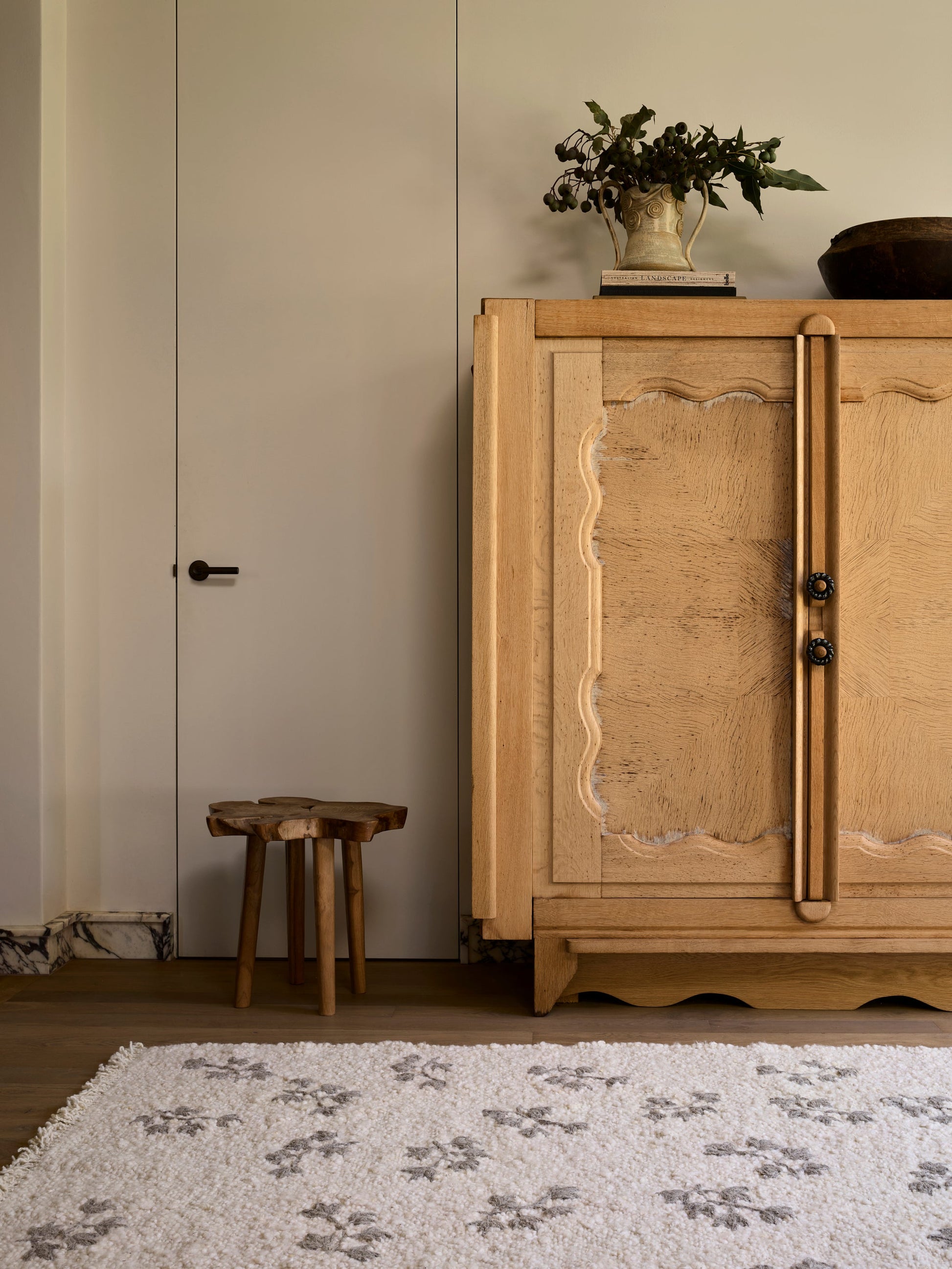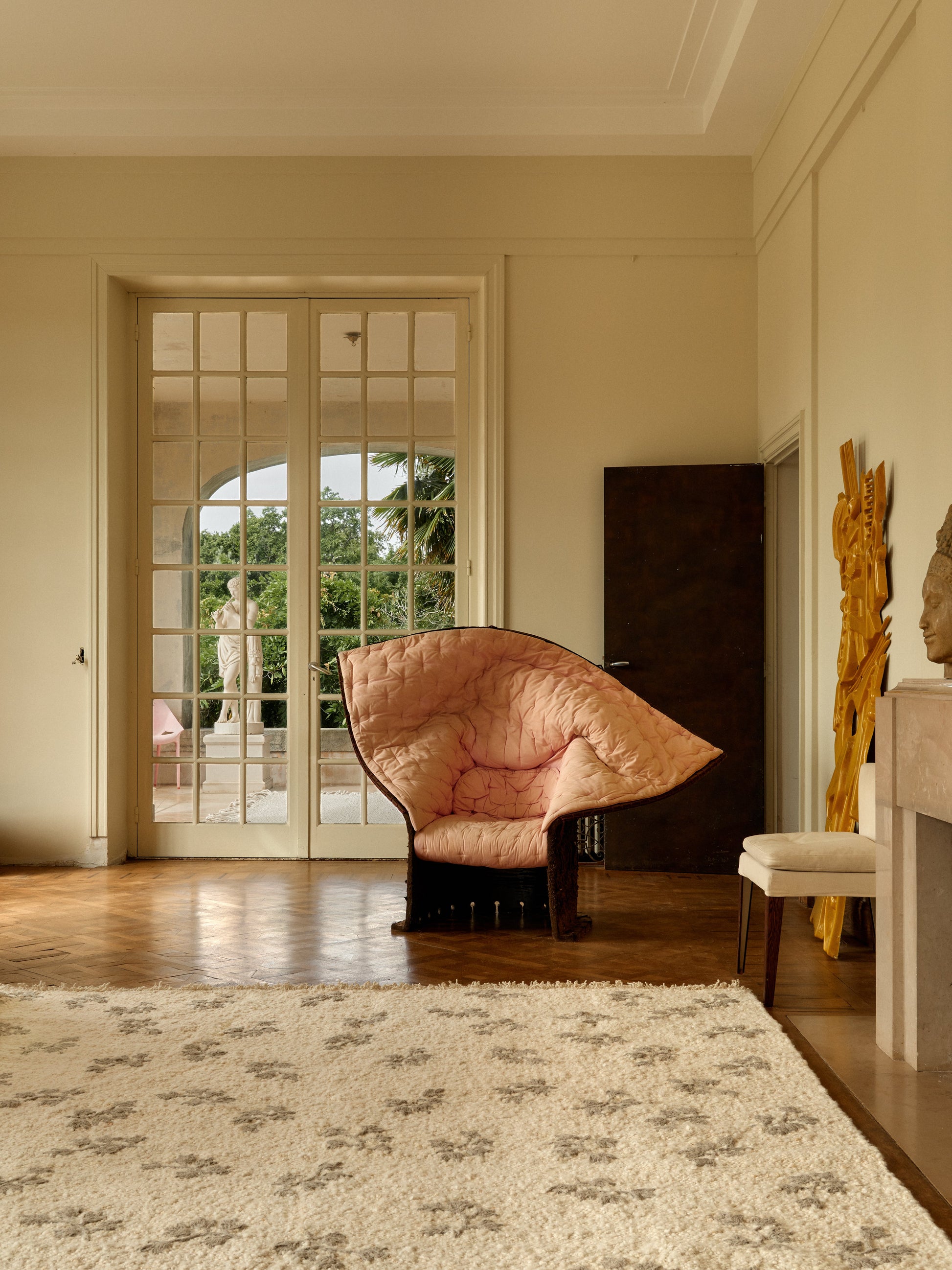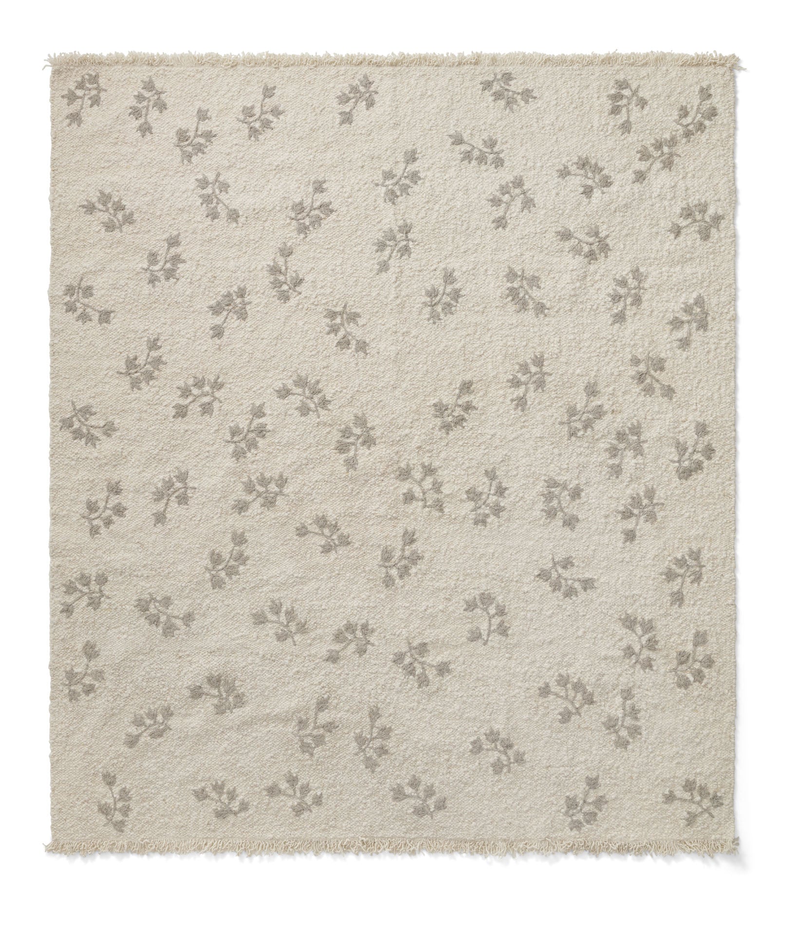 It is made in natural New Zealand wool with handspun slub yarn, creating an irregular foundation. No.16 is designed in a chalky off-white shade with a floral motif portraying an interpretation of the French lily. Each rug is glided with hand-embroidered flowers, so every flower bears its unique charm, adding an element of authenticity and individuality to the design