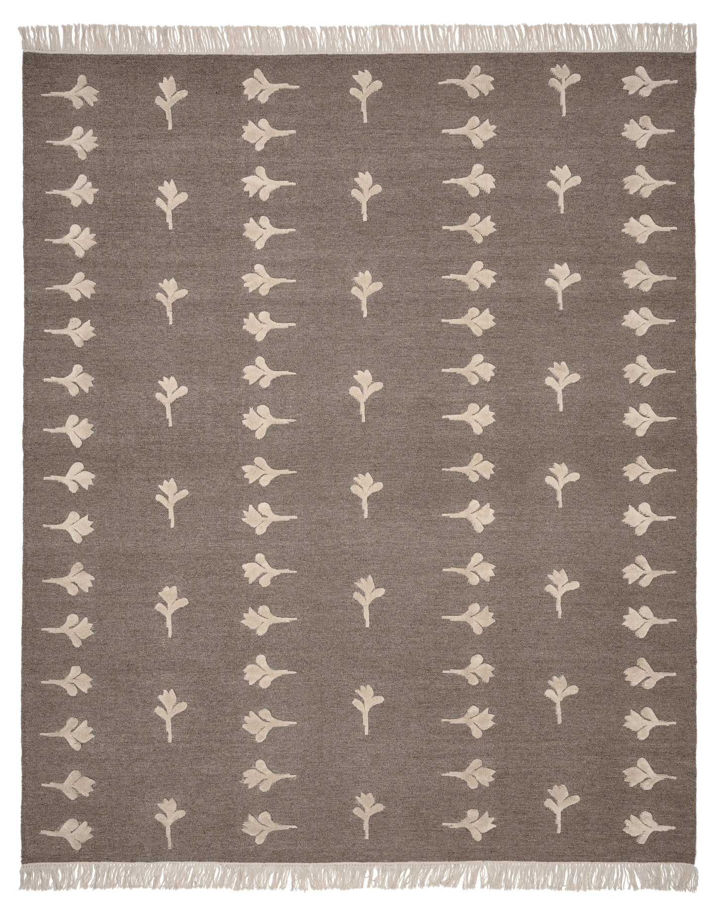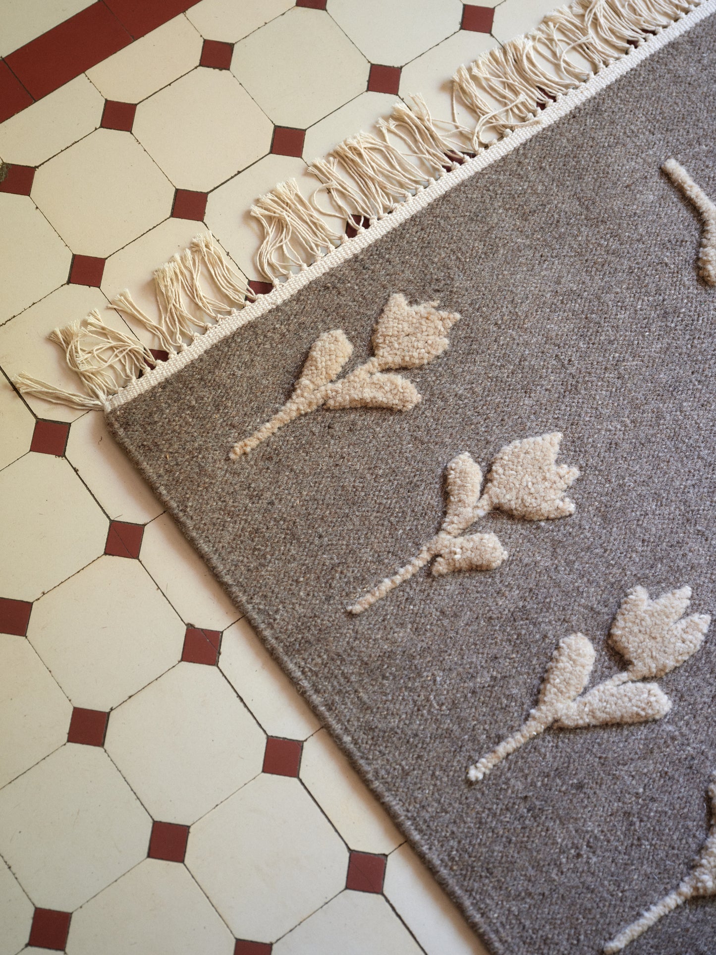 Rug no.18 is a grey-brown flat-woven rug with a light beige hand-knotted floral pattern, which gives a slightly high-and-low effect, made in natural wool. The flower design draws inspiration from ancient Scandinavian tulip patterns and brings a homage to these roots.