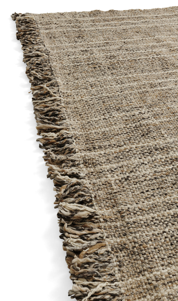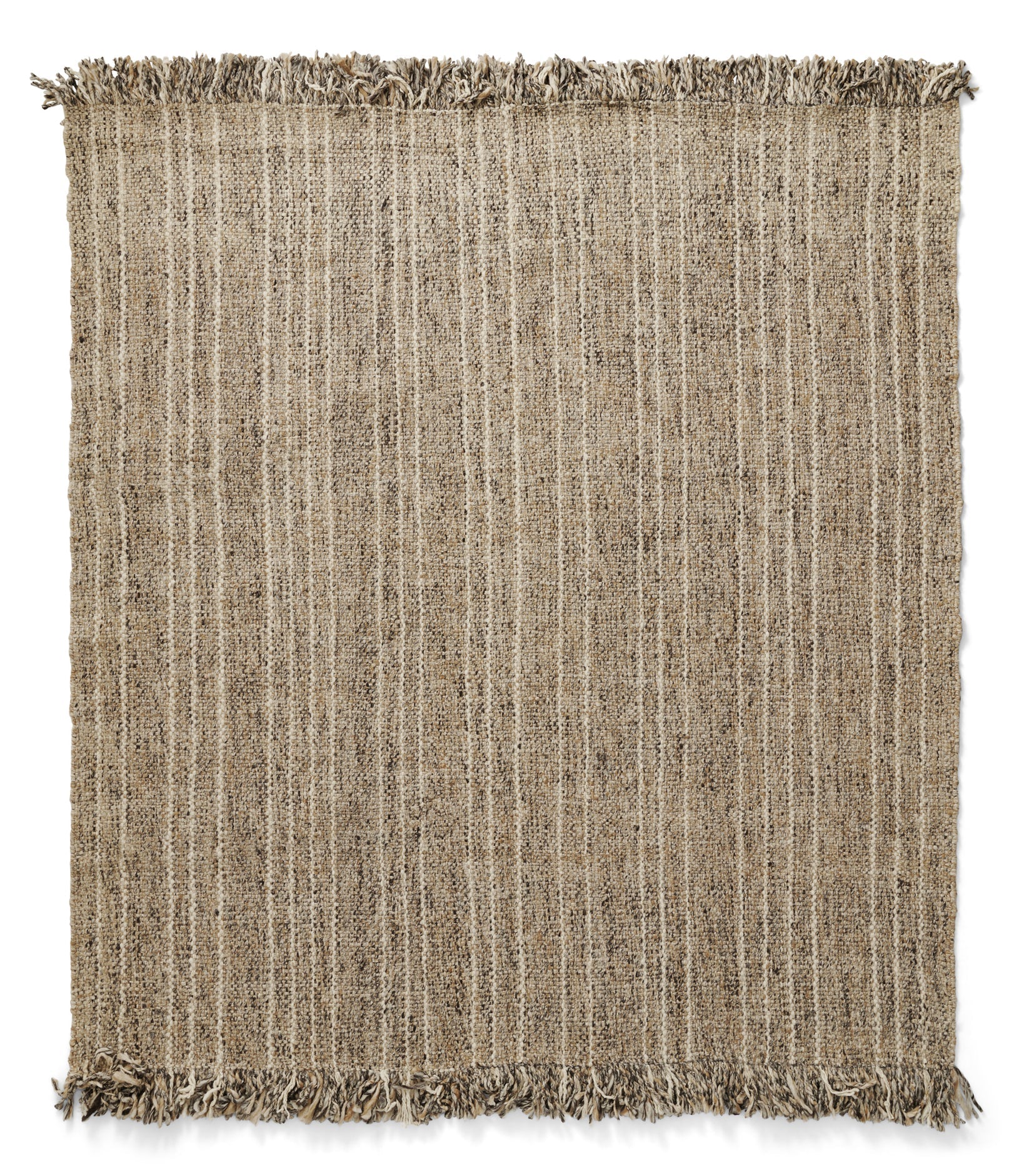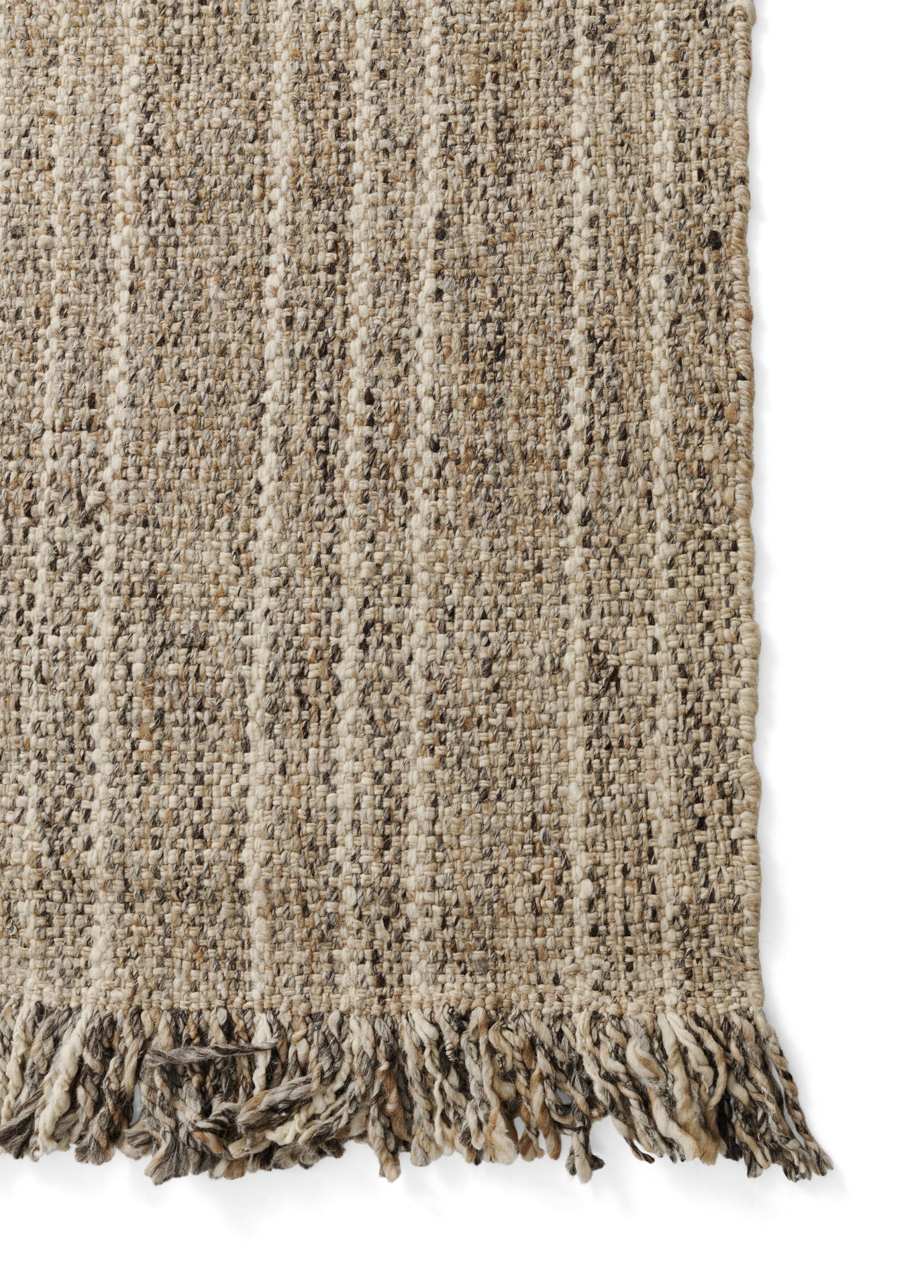 Has a mid-beige melange foundation with a soft sandy-shaded stripe, creating a harmonious and delicate effect. This rug is designed with the warp running as fringe that elevates the design, providing extra details while exuding a serene ambiance in your room.-
