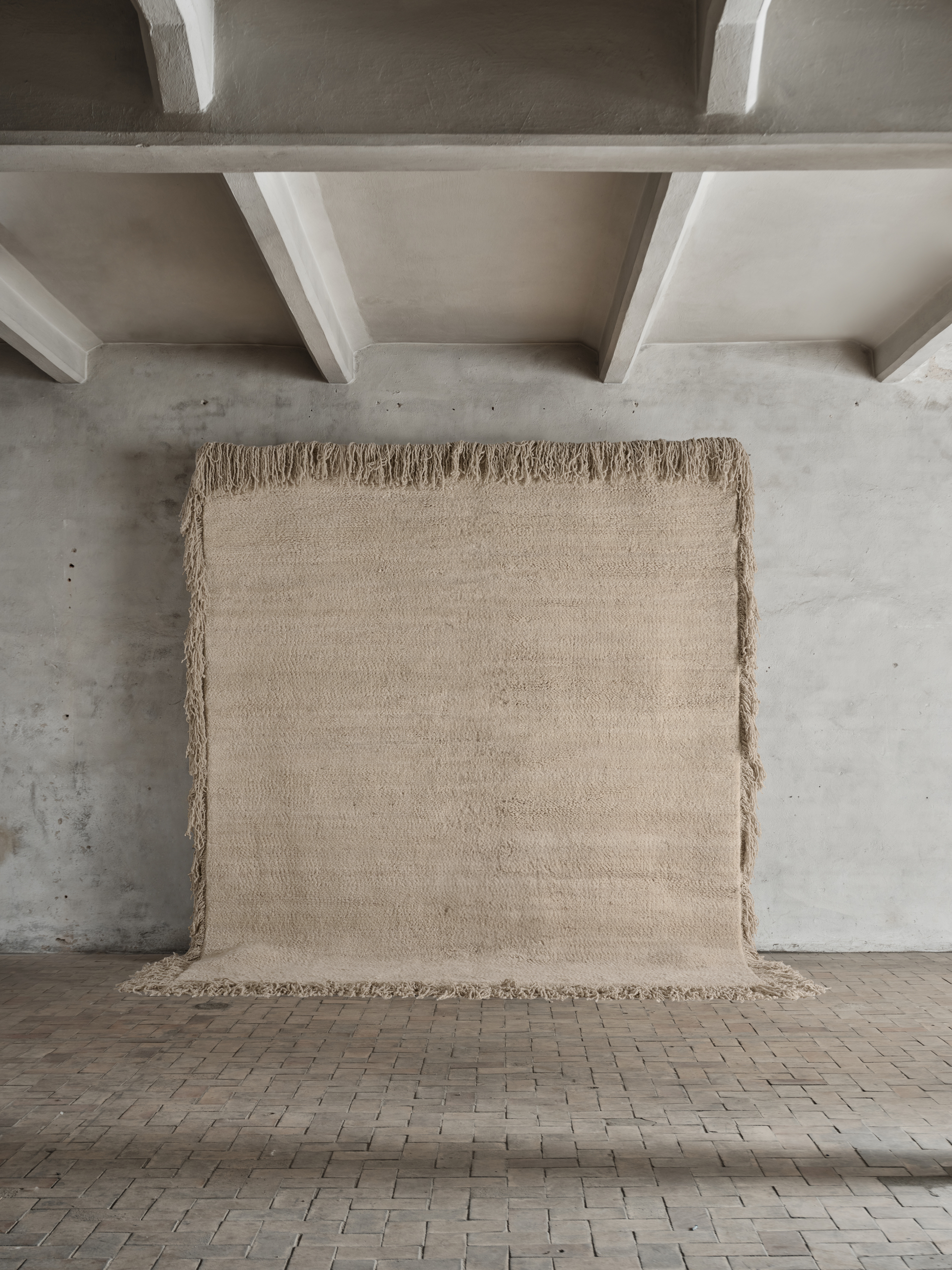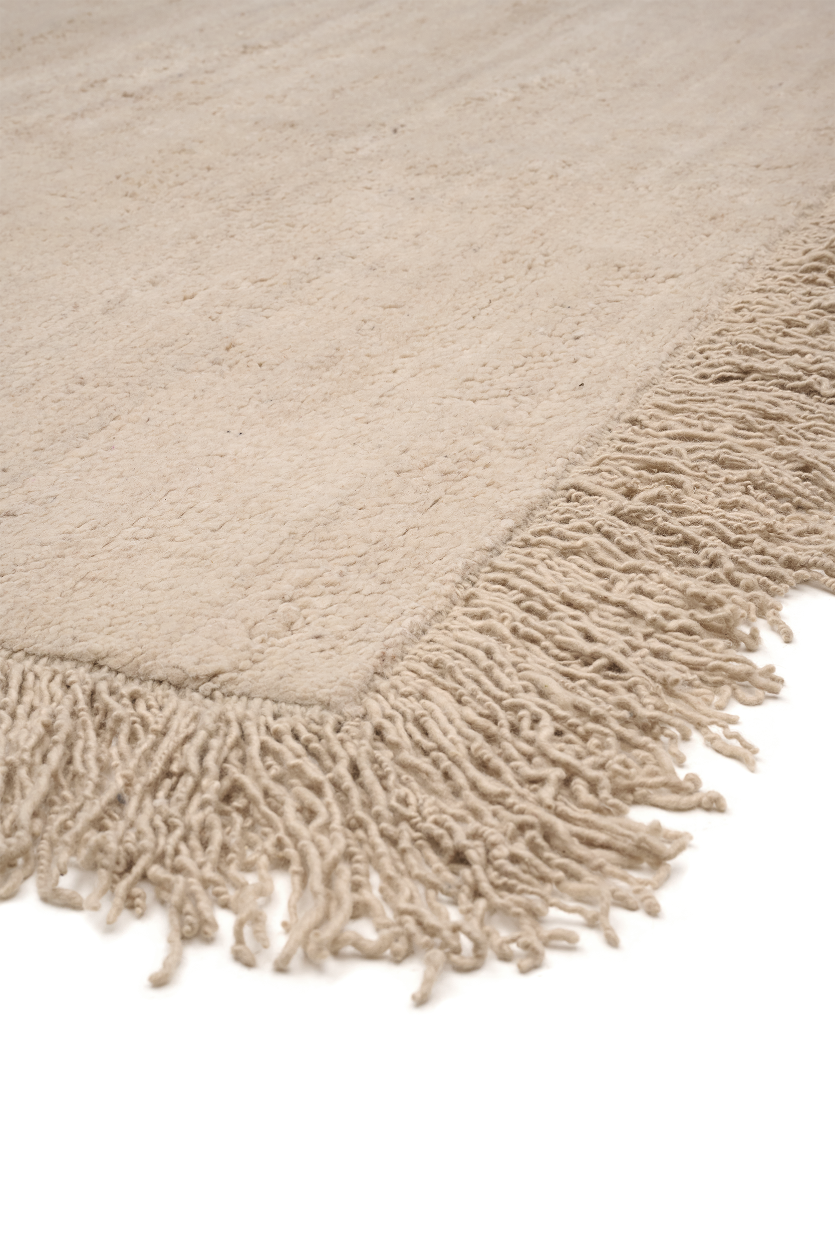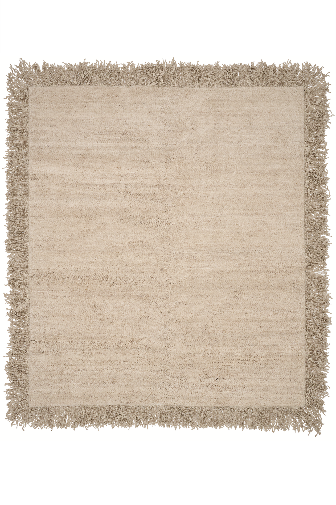 Limited edition: Rugs no.21 is a decorative hand-knotted rug with exaggerated details. The design is based on our best-selling product, no.10, now available in as a limited edition in a new shade. The heavy and compact rug in luxury chunky wool is cut in a short pile and made of unbleached wool with a natural mélange that gives it life and authenticity. The bold and curly hand-spun slub-yarn frames the edges and lends a soft vibe to this elegant rug.
