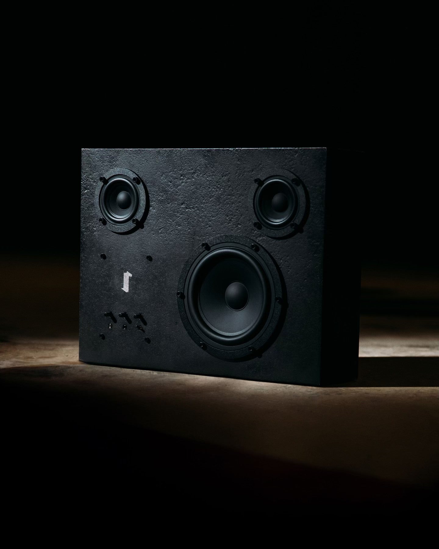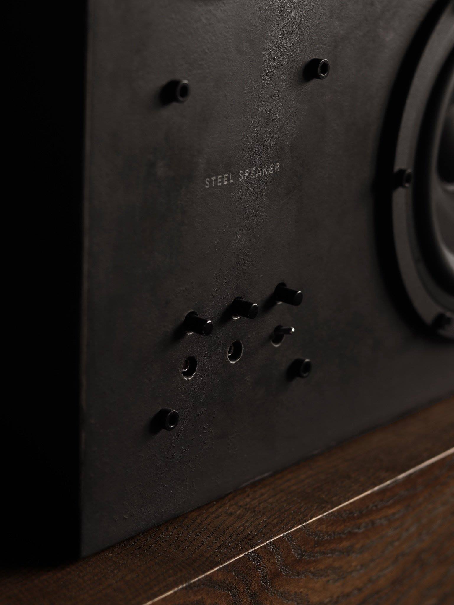 This speaker was handcrafted by blacksmith Jonas Majors in his workshop on the island of Mörkö south of Stockholm. The Steel Speaker is a heavy beast of 20 kilograms. It is supposed to manifest the power of our big speaker acoustic platform by its mere presence. The electronic appliance industry seems many times over crowded by black boxes. Therefore we saw it as our challenge to make the black box into a sculptural piece of craft that elevates a contemporary designed interior rather than violating it.