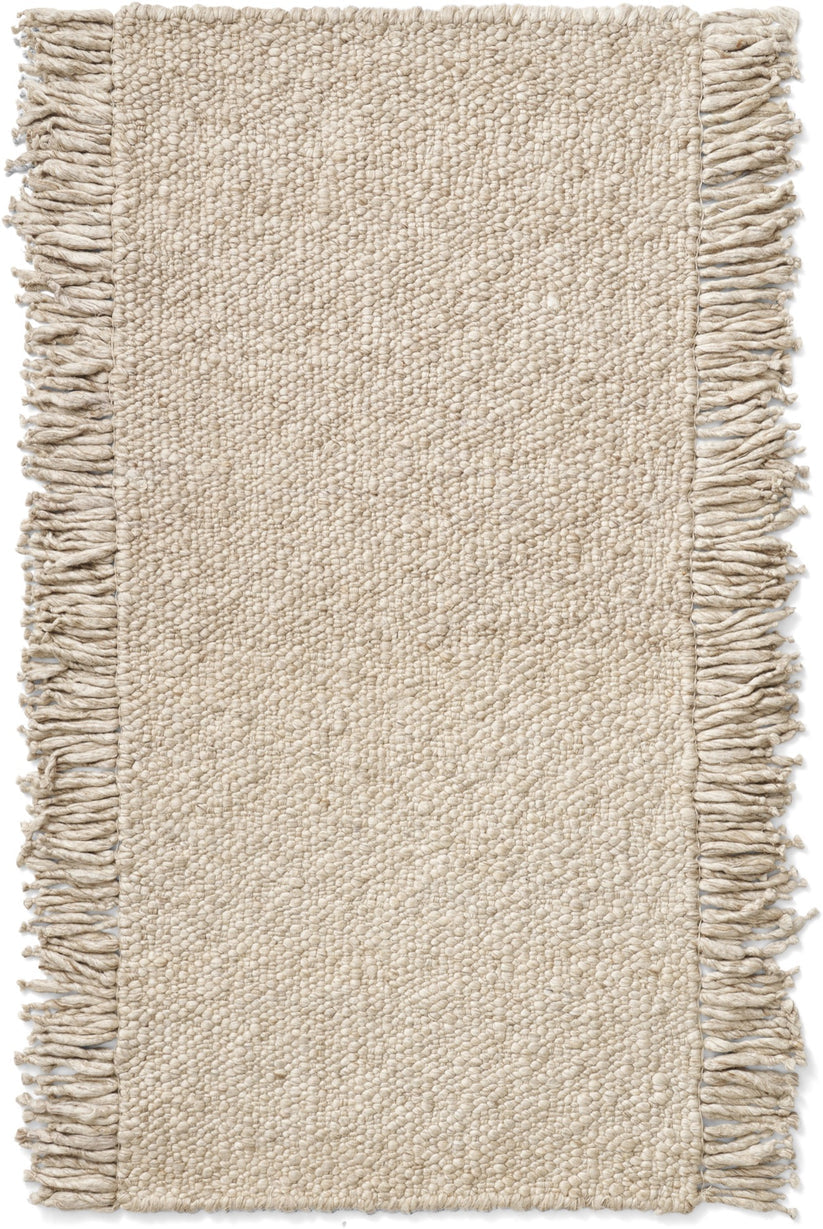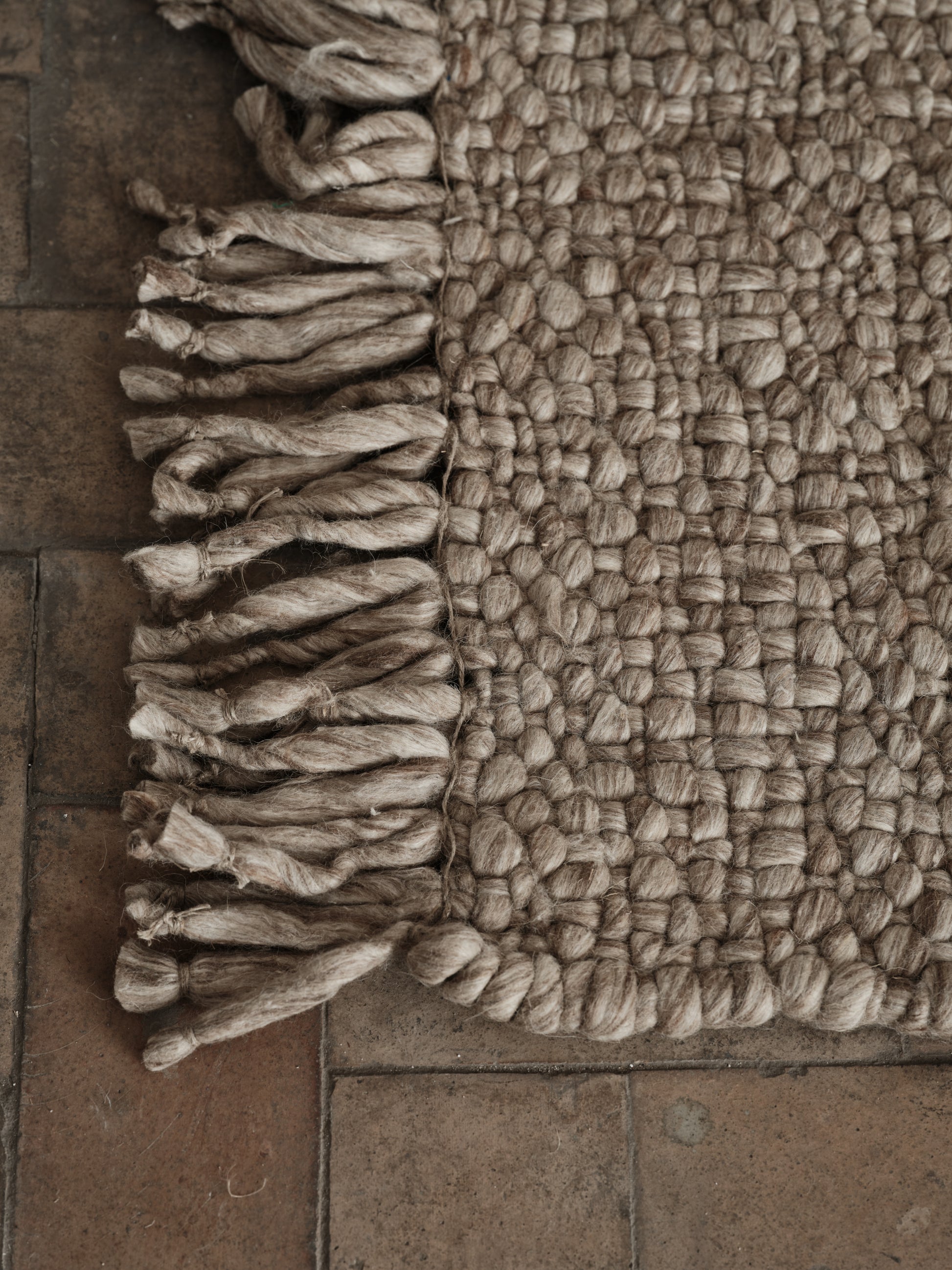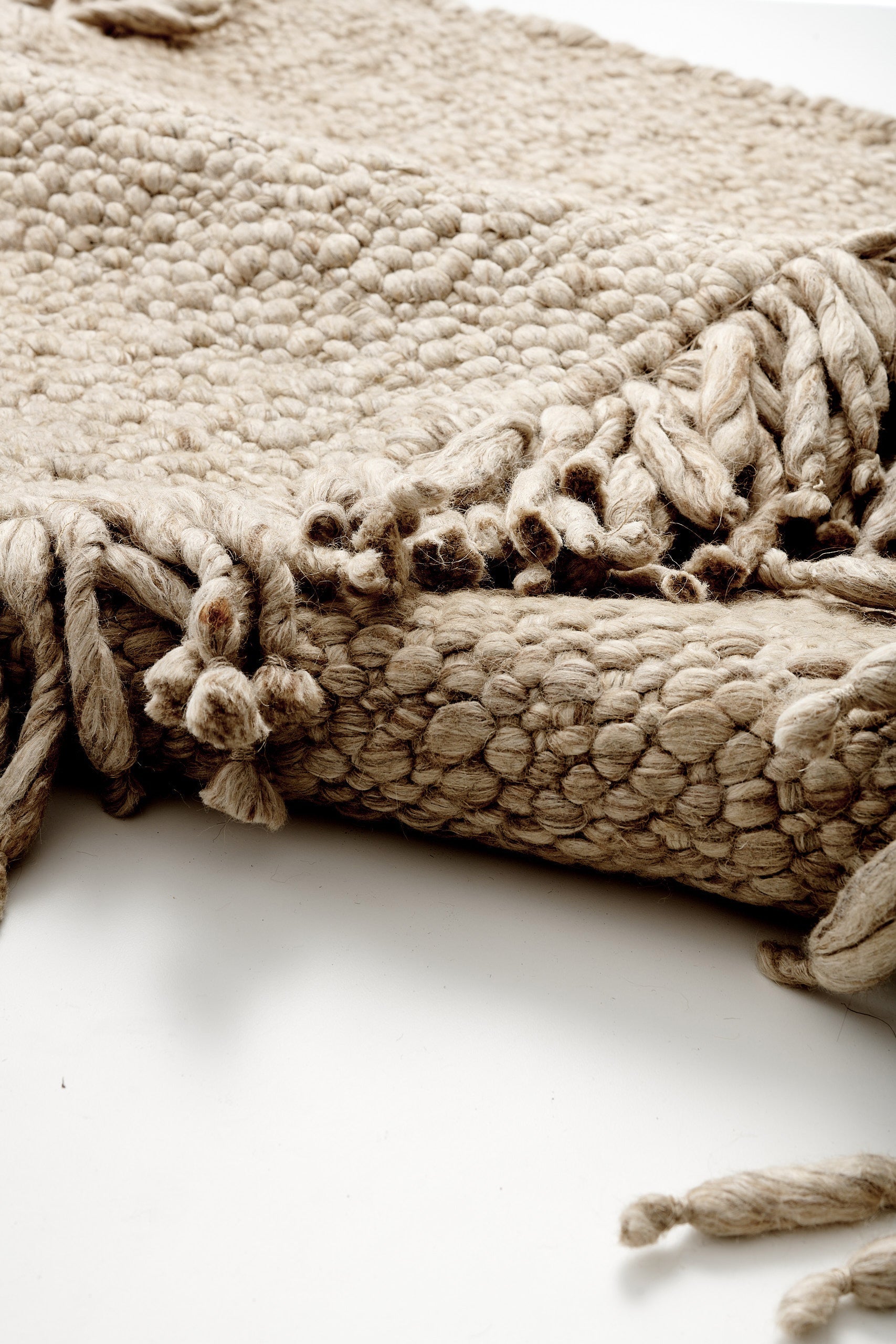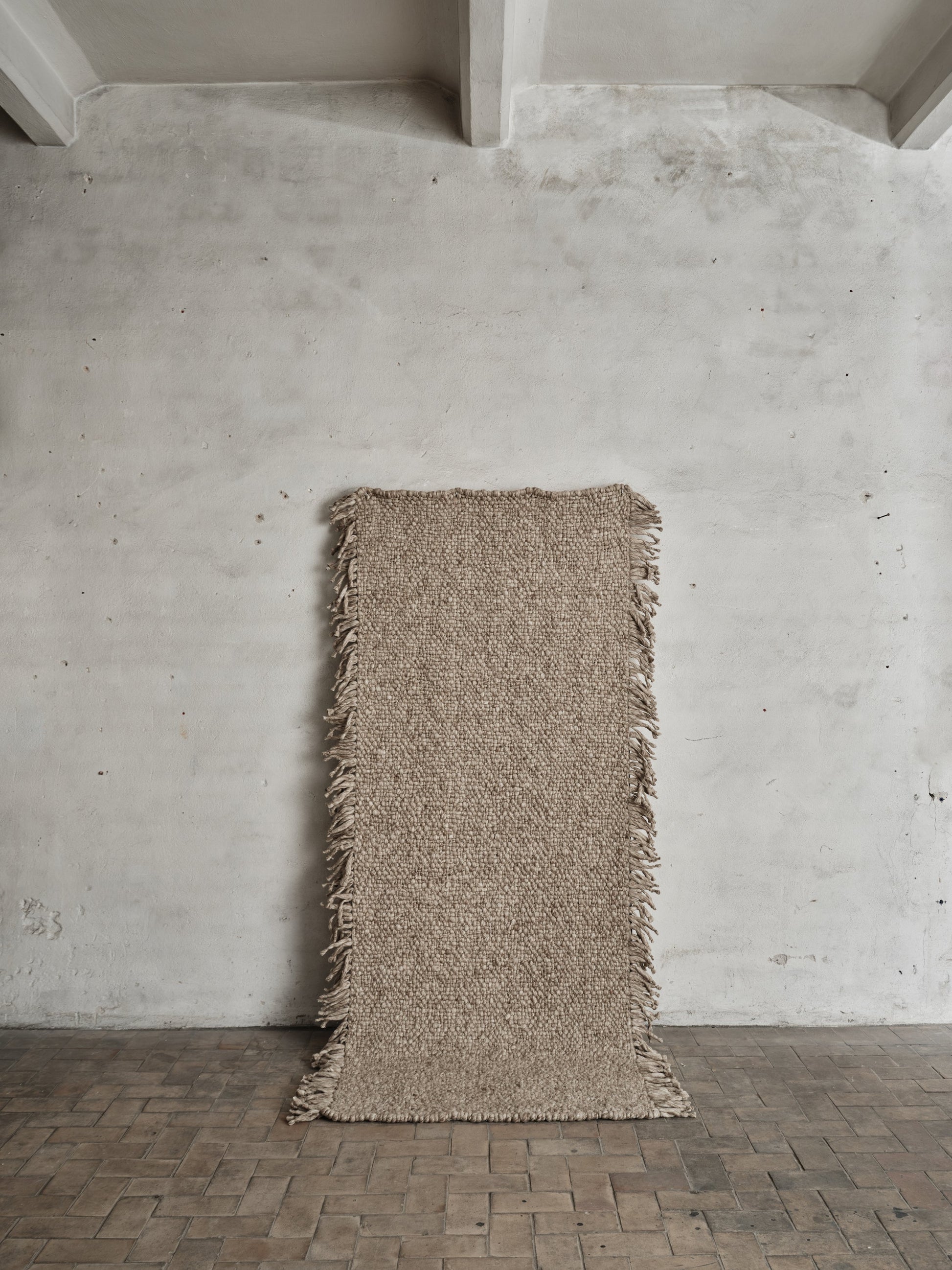 Colonnade no.03 is a heavy, compact, and rustic rug created in luxury chunky wool and woven in a classic basket weave construction. The bold and over-dimensioned yarn runs through the entire rug and transitions into fringes. Any variation in color or detailing is a result of the handcrafted nature of this item and makes each piece unique.