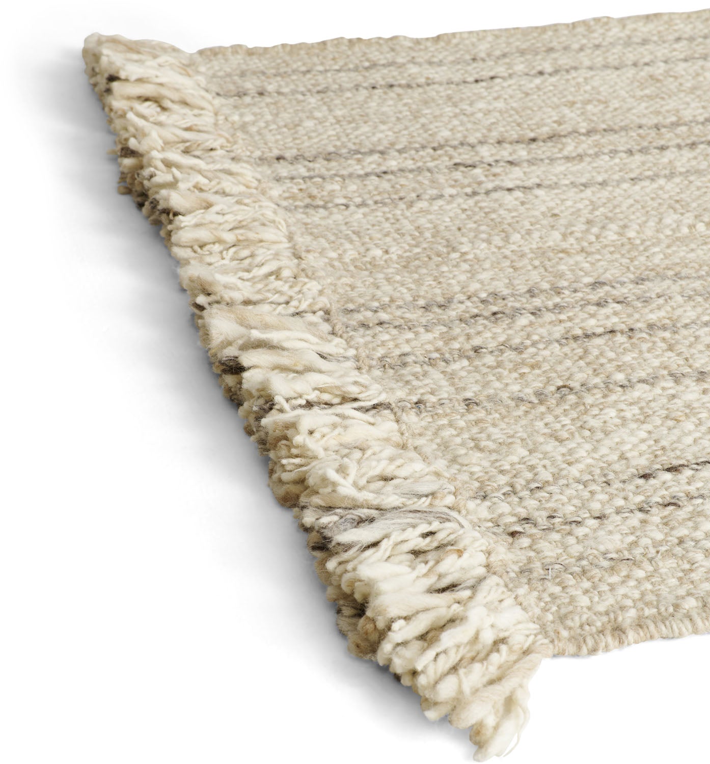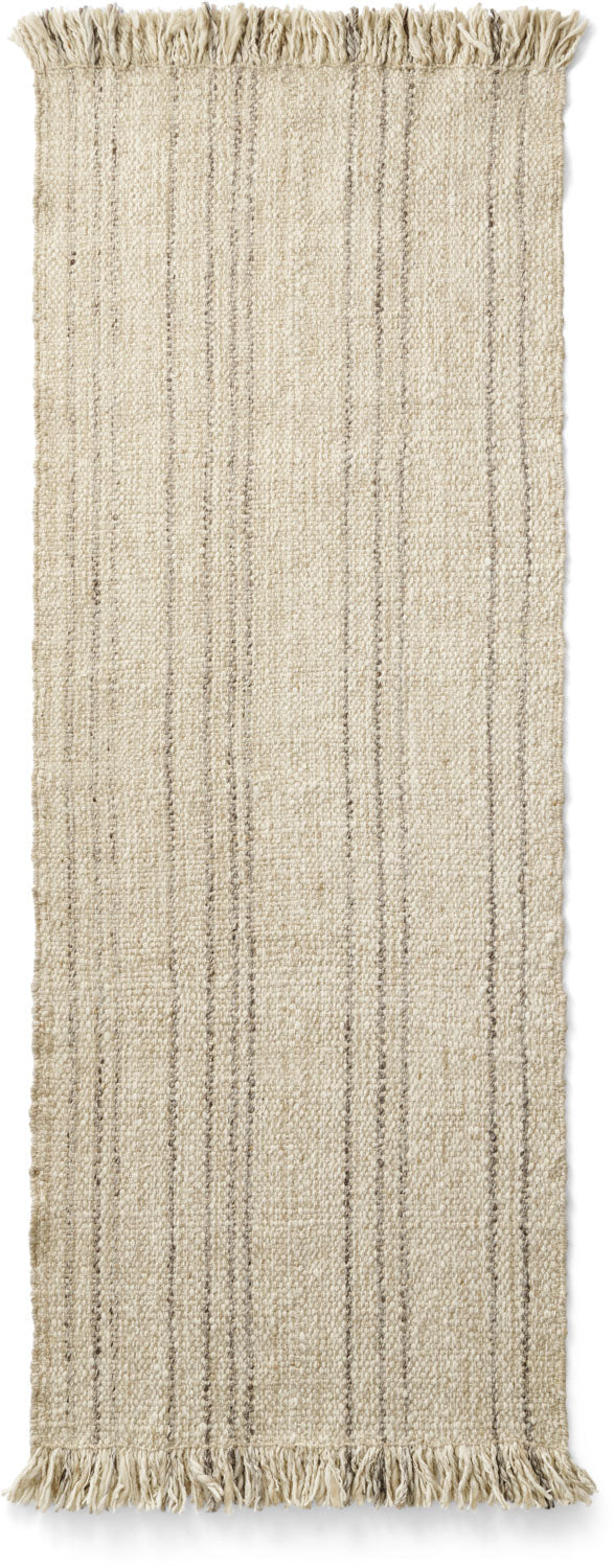 Colonnade no.06 is a hand-woven wool rug designed for narrow spaces. no.06 features a gentle light melange beige shade adorned with subtle darker grey-brown stripes, creating a harmonious and delicate effect. This colonnade is designed with the warp running as fringe that elevates the design, providing extra details while exuding a serene ambiance in your room. Any variation in color or detailing is a result of the handcrafted nature of this item, which makes each piece unique.