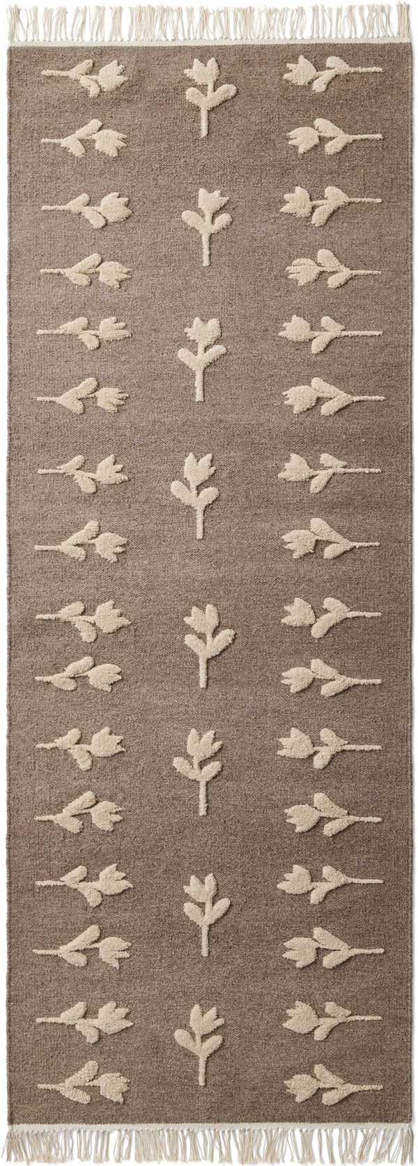 Colonnade no.08 is a light flat-wovenhandmade rug in natural wool. The rug is designed in a mid-beige foundation with soft brown woven flowers for a natural impression. The flowers draw inspiration from ancient Scandinavian tulip patterns that traditionally adorn everything from porcelain to carpets and curtains. A thin fringe row decorates the edgesproviding a simple but important detail to the overall design.
