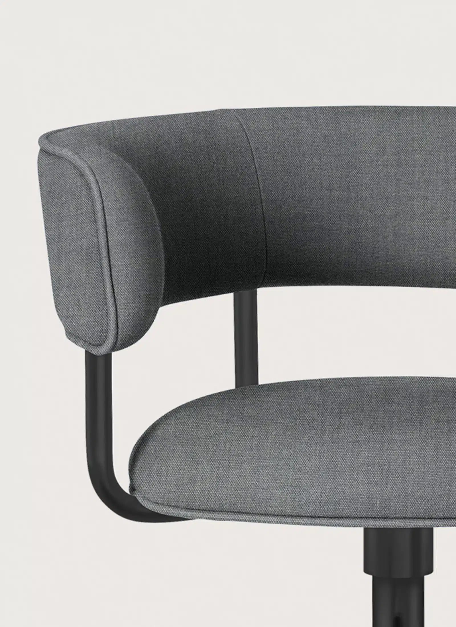 Font Swivel wheels armchair with matte black steel frame is an office chair suitable for the meeting room or the home office. As a line extension to the Font collection, the design of Font Swivel is familiar. The Font collection and Font Swivel are interconnected through their design which is evolved from the geometry of the circle. The base is a special made design only available for Font Swivel. It’s a well-balanced mixture of classic and elegant design and functionality.