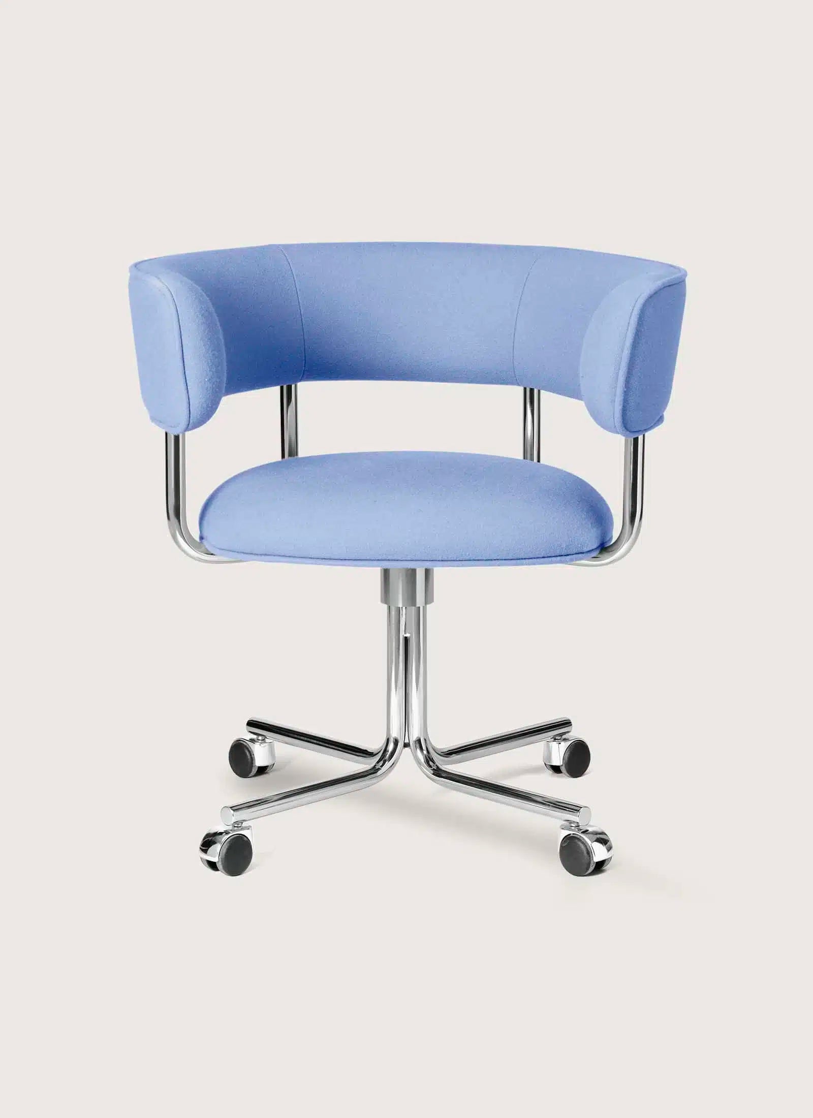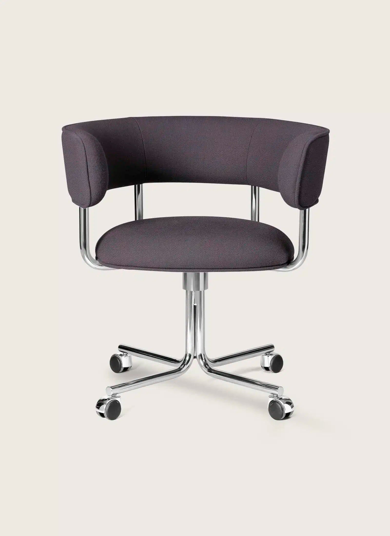 Font Swivel wheels armchair with mirror polished steel frame is a comfortable office chair. Font Swivel is suitable for the meeting room or the home office. As a line extension to the Font collection, the design of Font Swivel is familiar. The Font collection and Font Swivel are interconnected through their design which is evolved from the geometry of the circle. Designed by David Thulstrup. The base is a special made design only available for Font Swivel. It’s a well-balanced mixture of classic and elegant design and functionality.