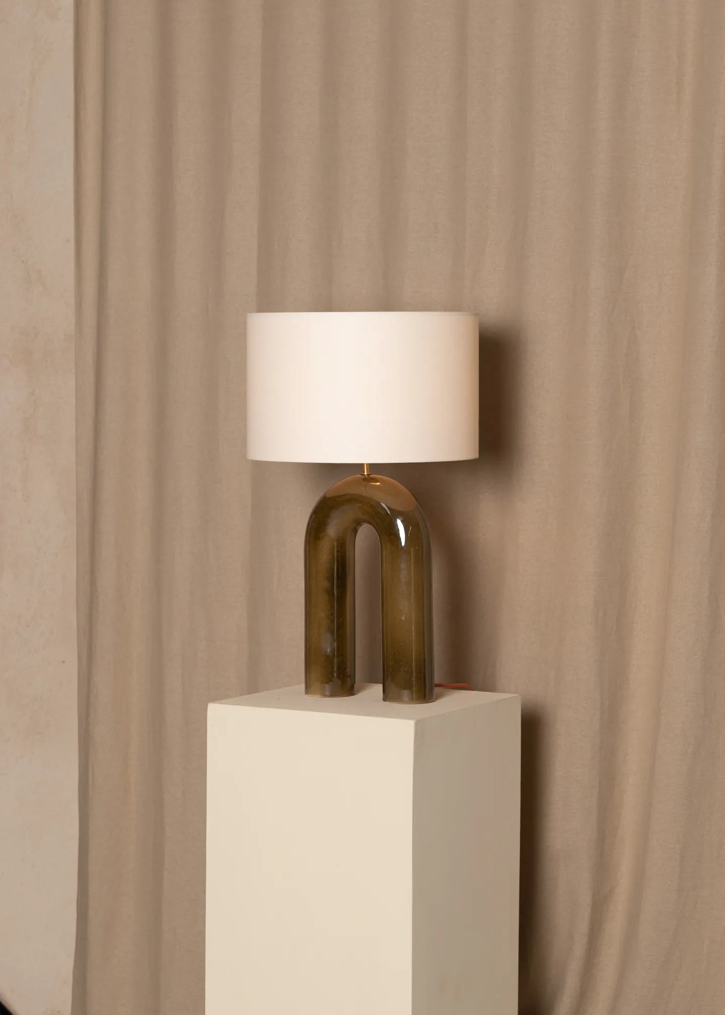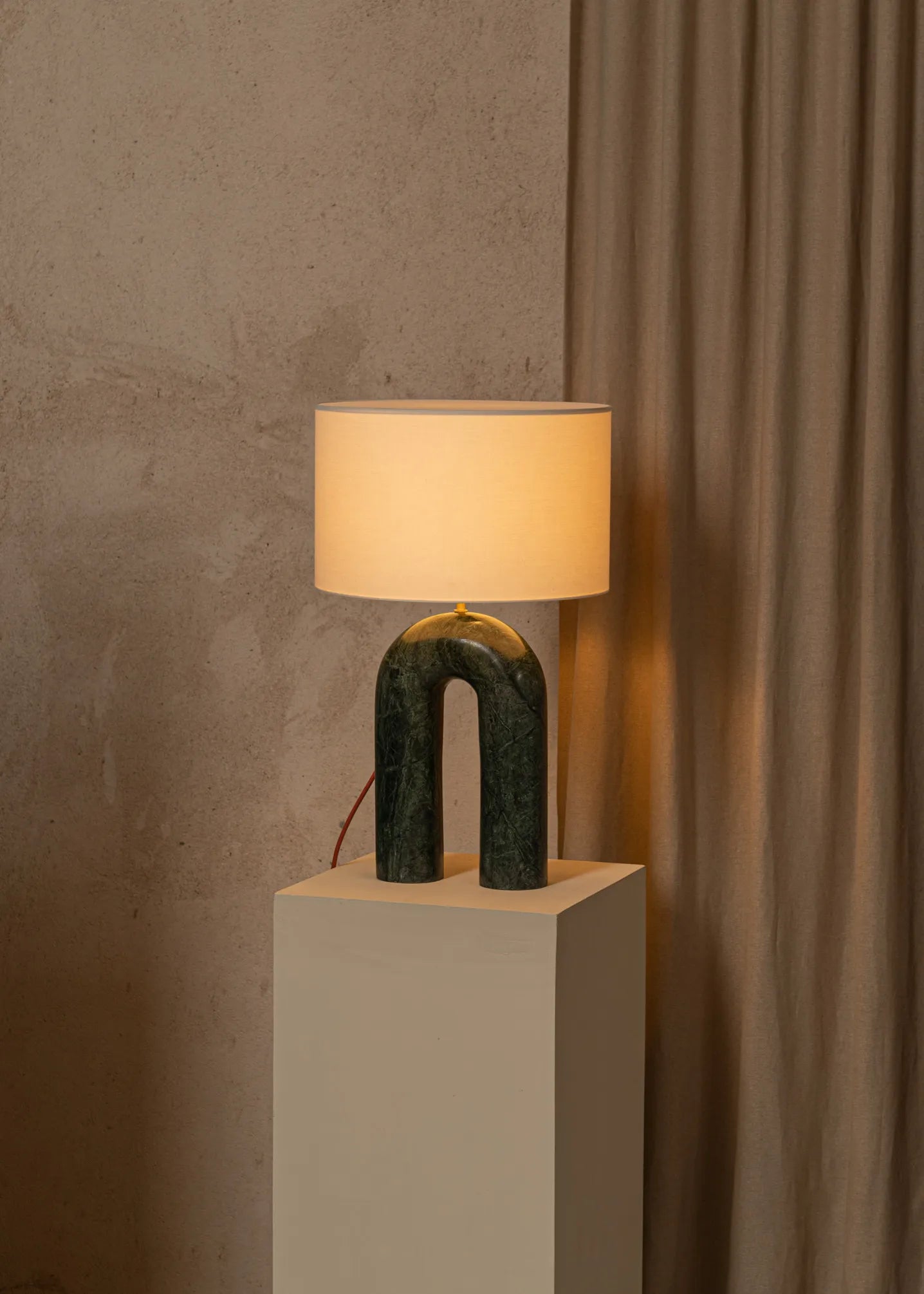 Our iconic design and its unique arch shape, inspired by the Nine Archs Bridge in Sri Lanka, making it a striking decorative piece. An unique cotton lampshade difusing a soft and harmonious light and a wide selection of colours through two finish options, ceramic or marble