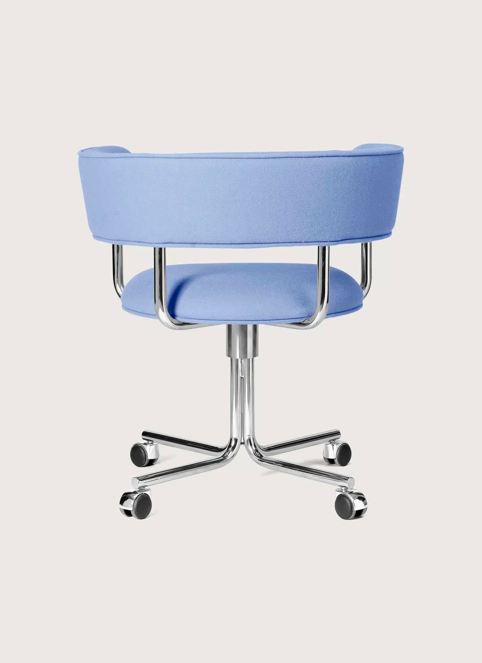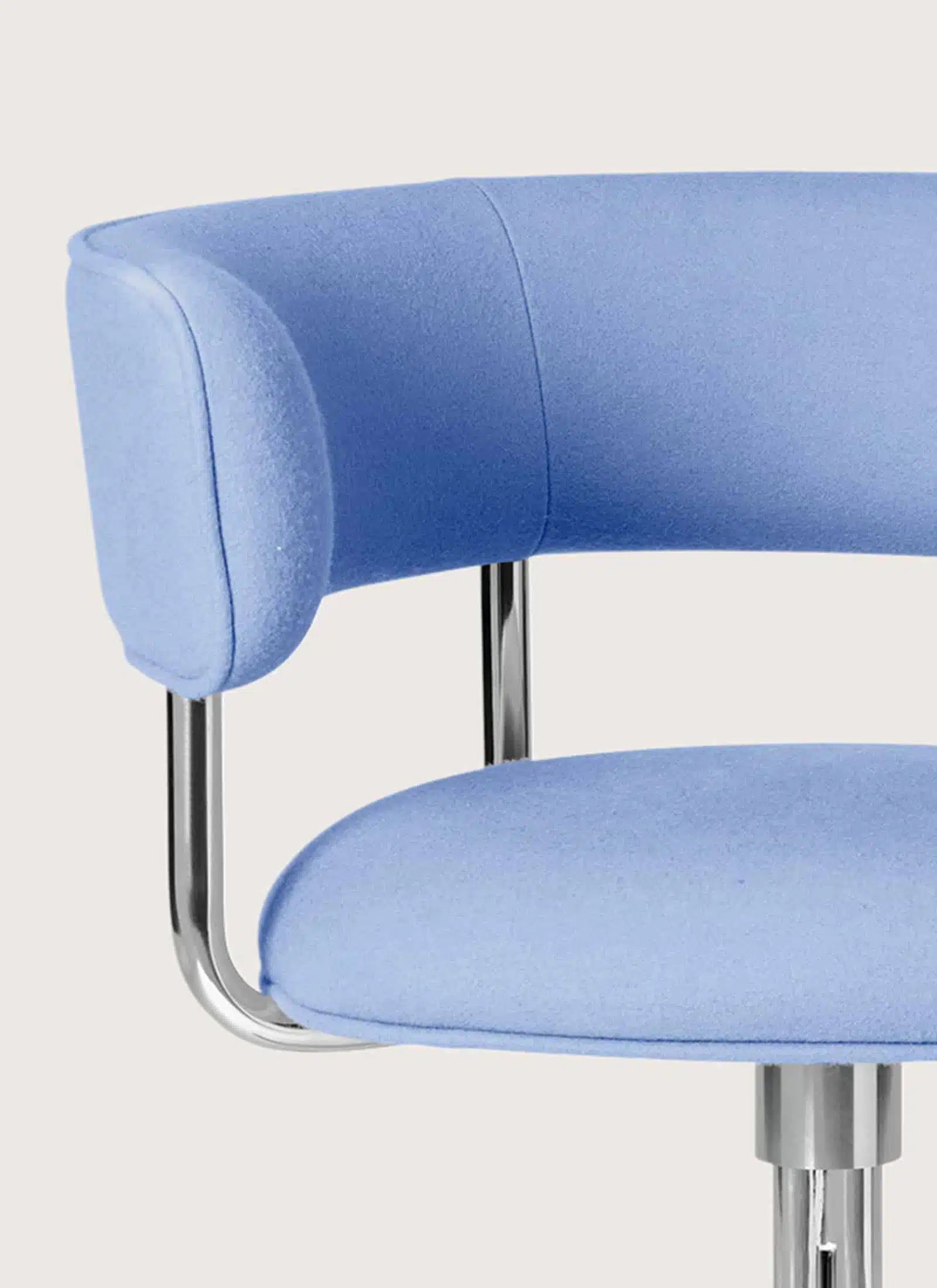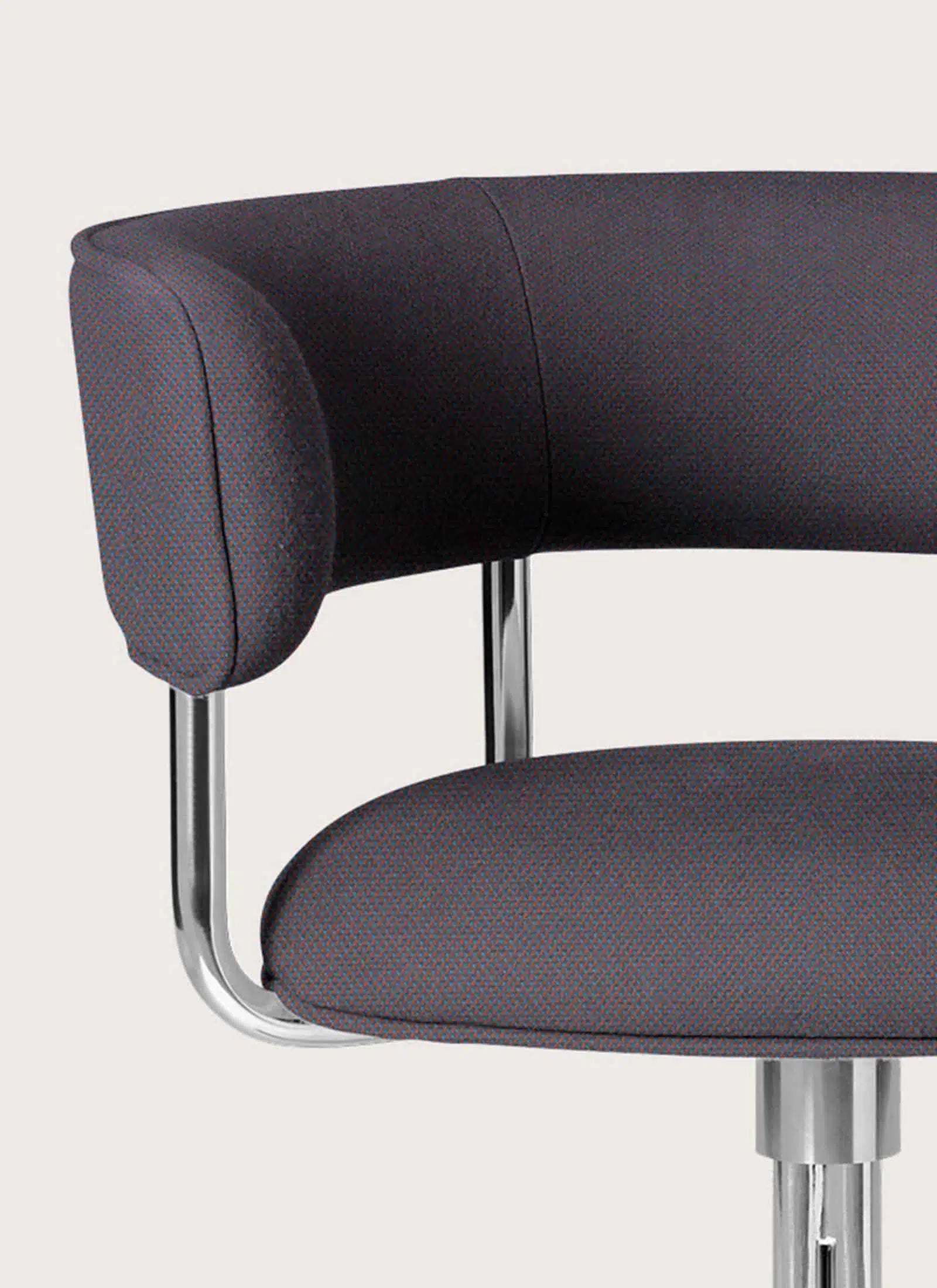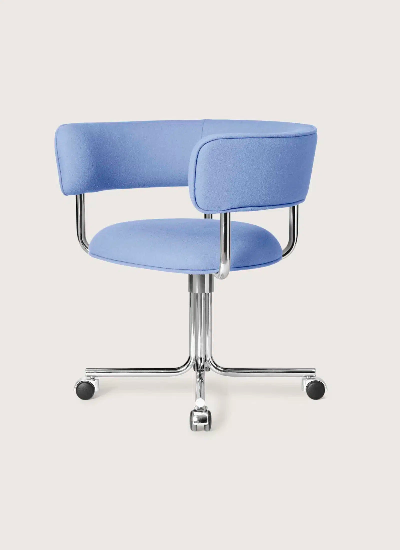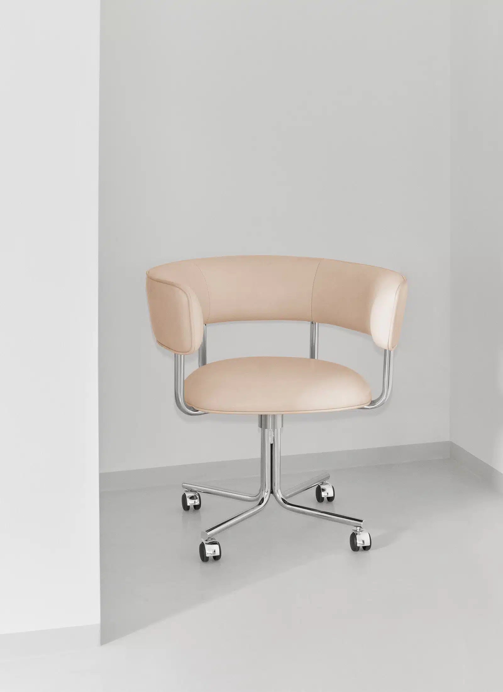 Font Swivel wheels armchair with mirror polished steel frame is a comfortable office chair. Font Swivel is suitable for the meeting room or the home office. As a line extension to the Font collection, the design of Font Swivel is familiar. The Font collection and Font Swivel are interconnected through their design which is evolved from the geometry of the circle. Designed by David Thulstrup. The base is a special made design only available for Font Swivel. It’s a well-balanced mixture of classic and elegant design and functionality.