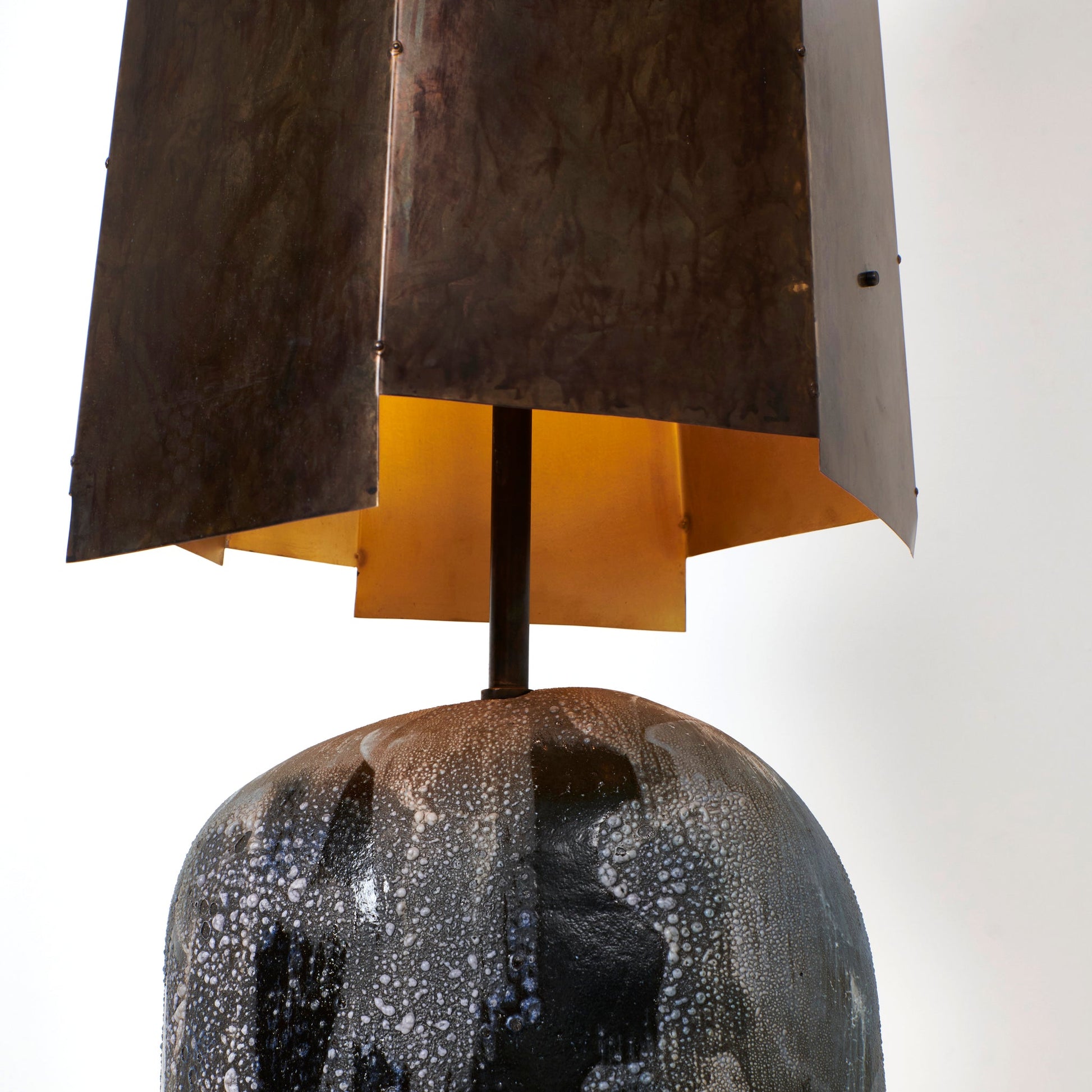 Large artisanal ceramic floor light with an organic shape and large geometric metal shade. The ceramic base is hand-sculpted in Project 213A's own ceramic workshop.