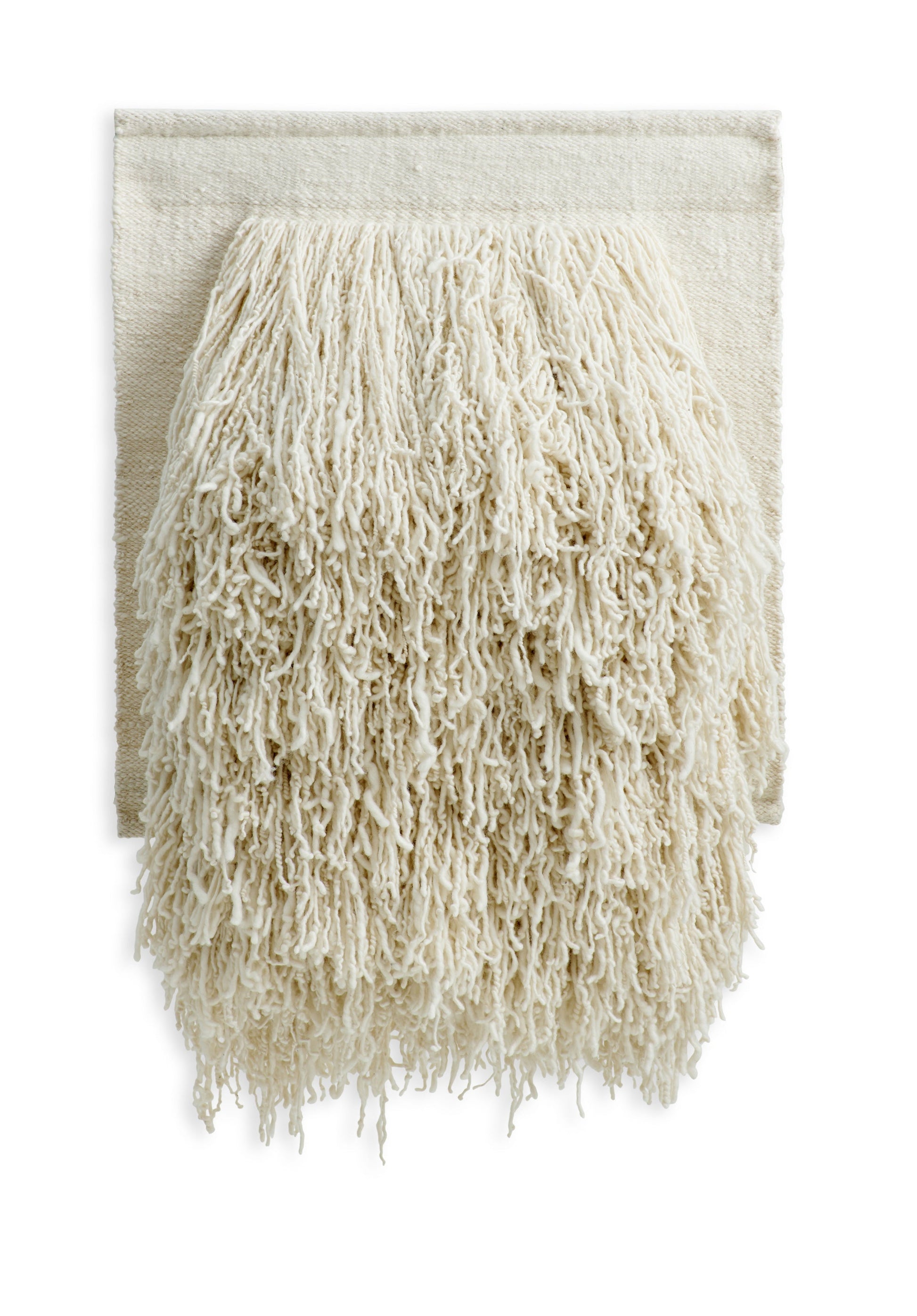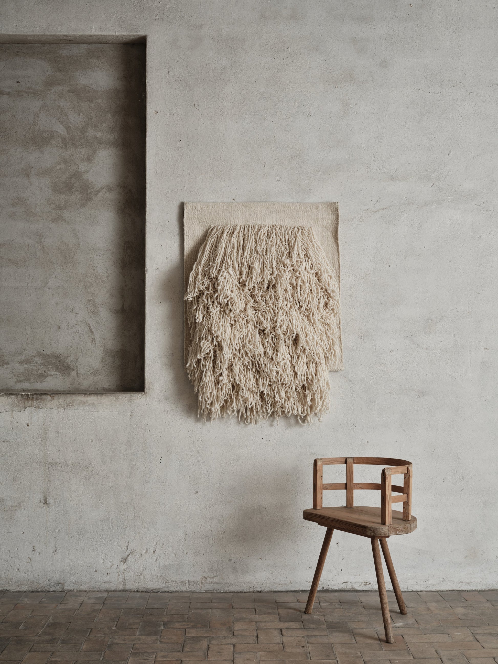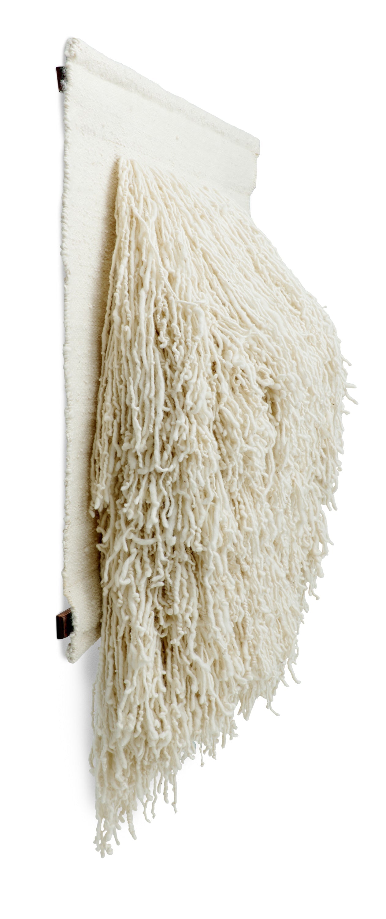 Tapestry no.04 is an expressive wall piece, perfectly balancing soft and bold. Its long handspun yarn in natural white New Zealand wool lends the piece a tactility that makes it stand out; literally and metaphorically. It is an avant-garde interpretation of traditional textile art, handcrafted and unique. The piece is hung using Sheesham wood planks, inserted in pockets on the flat weaved backing. Sheesham, one of the most durable and sustainable woods, is a native to India, where the tapestries are handcrafted.