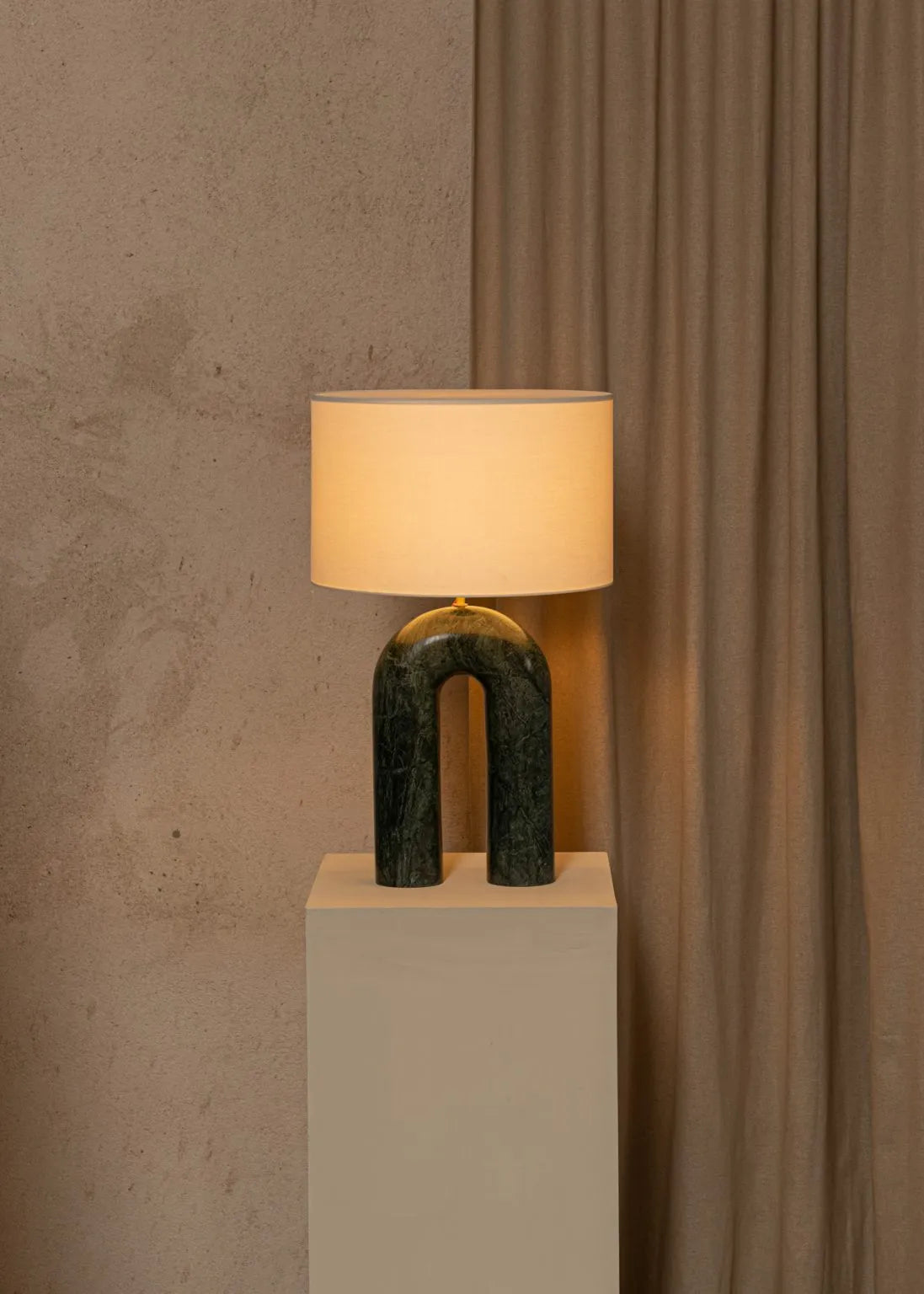 Our iconic design and its unique arch shape, inspired by the Nine Archs Bridge in Sri Lanka, making it a striking decorative piece. An unique cotton lampshade difusing a soft and harmonious light and a wide selection of colours through two finish options, ceramic or marble