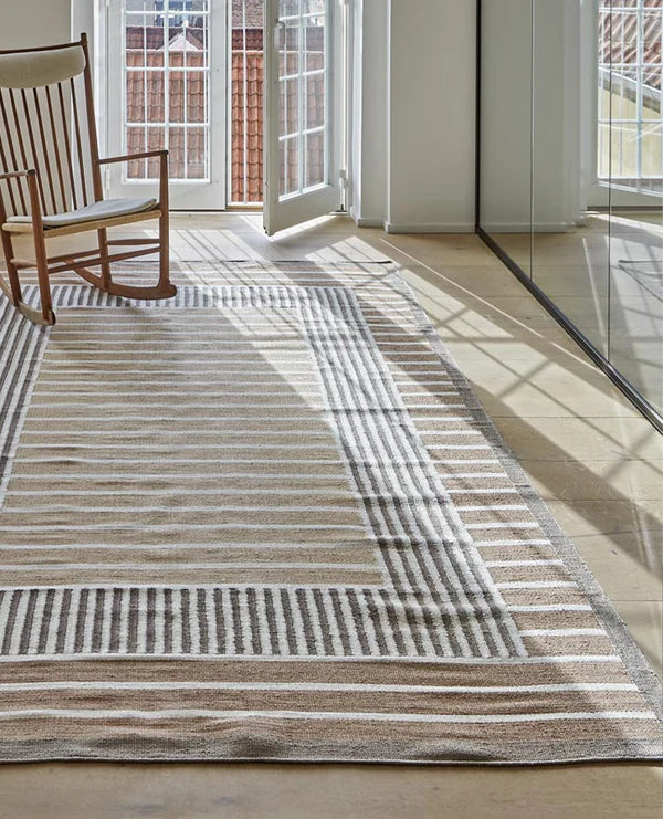 The colourful palette of the collection is a tribute to nature, while the unique pattern with flat weave and colour and weft effect, creates a different experience every time you enter the room. The rugs are bio-dyed, which gives them their natural colour hues that are woven in optical repetitions and interact depending on the light.