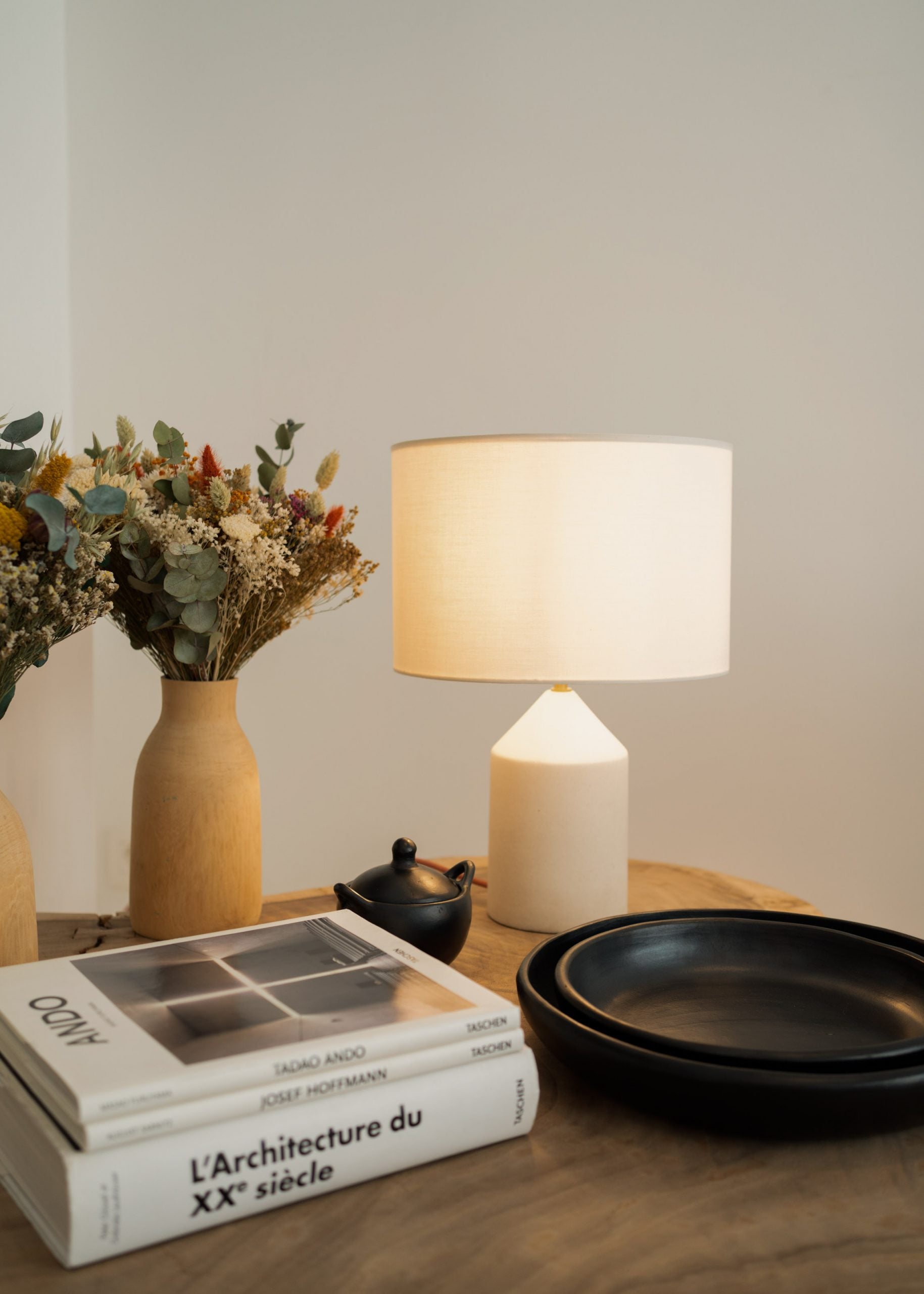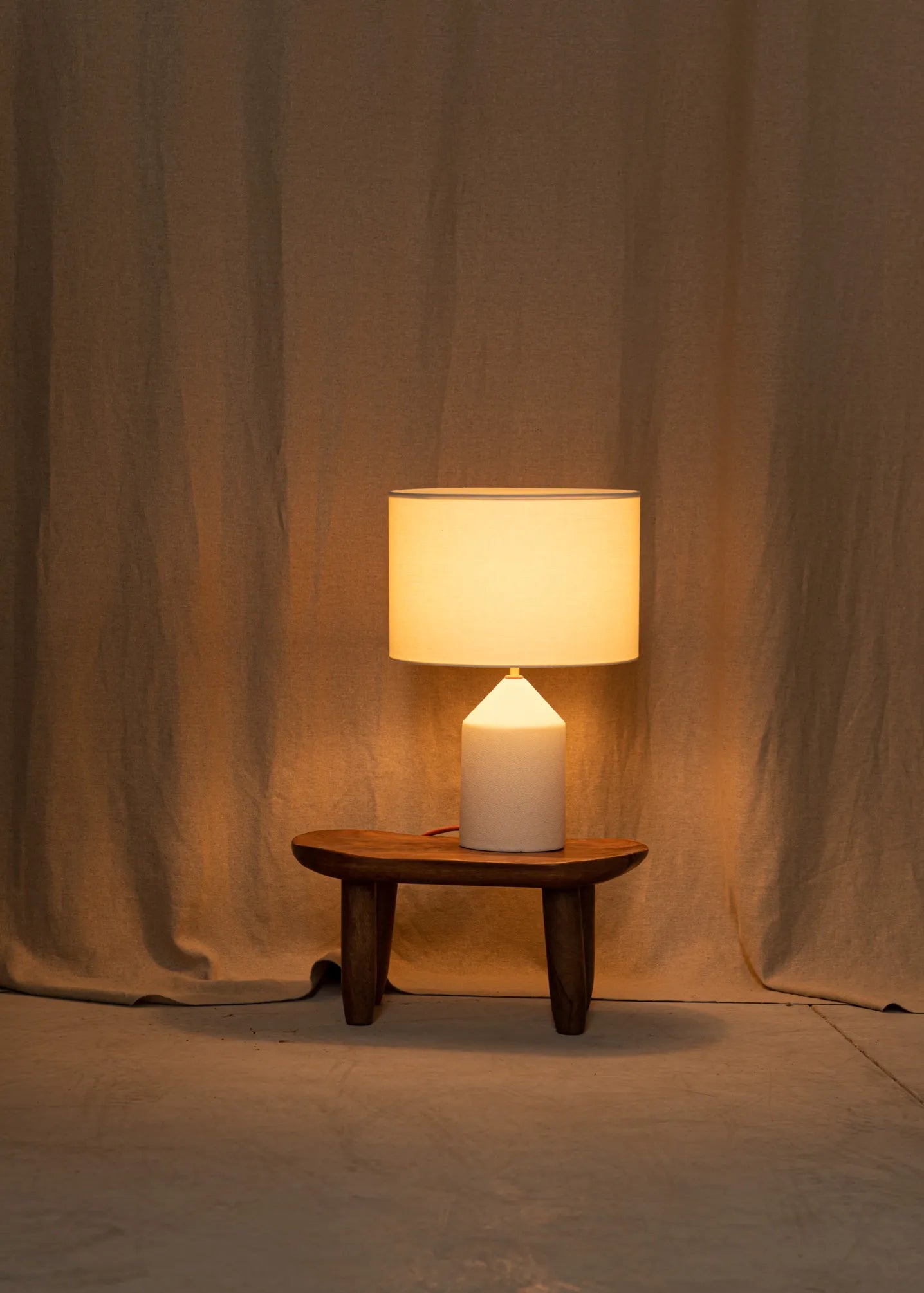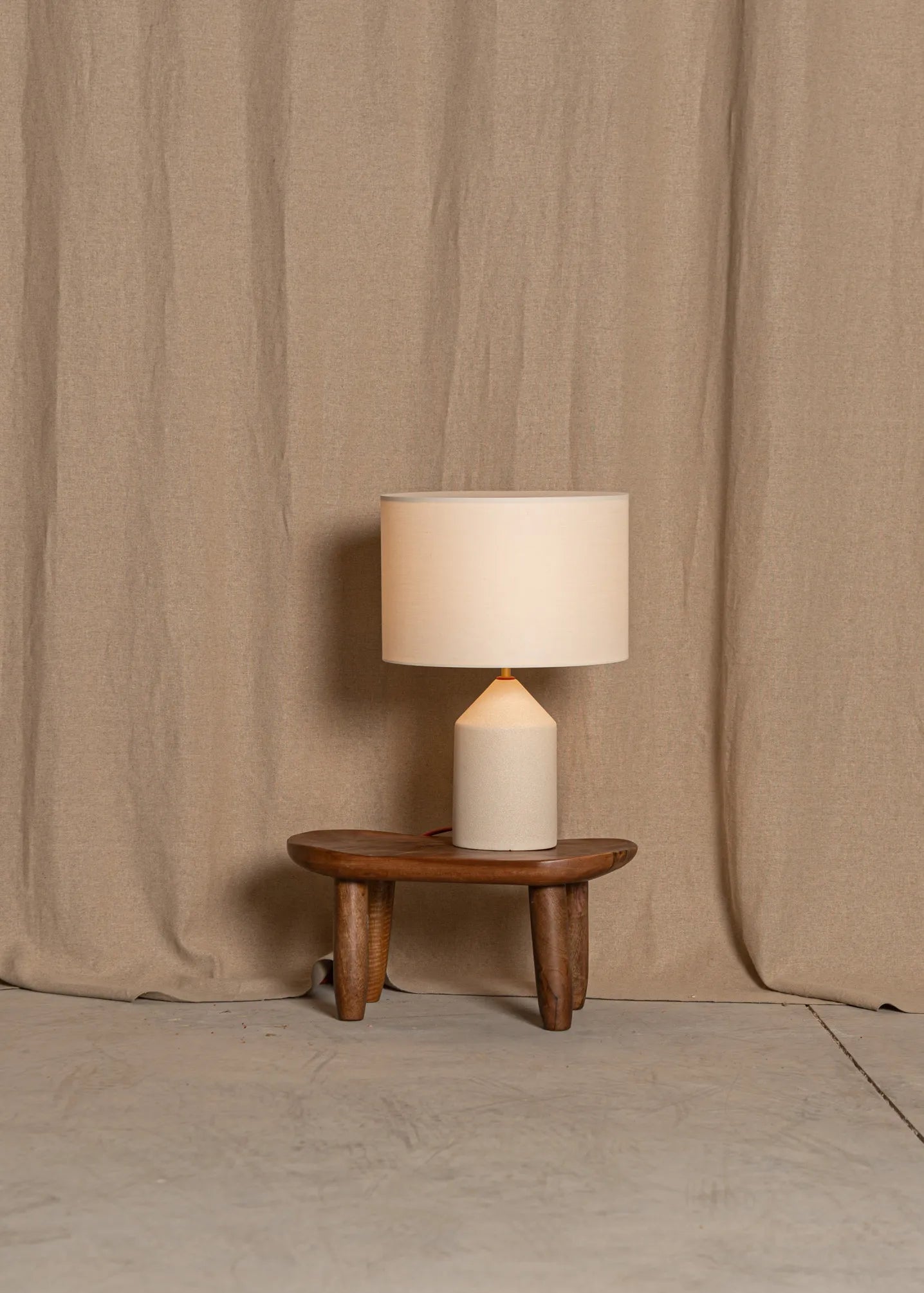 The Josef table merges cylinder and conical shapes on top of where sits an unique cotton drum lampshade, difusing a soft light. A perfect nightstand table lamp available in various finishes and colours (stone, ceramic and wood)