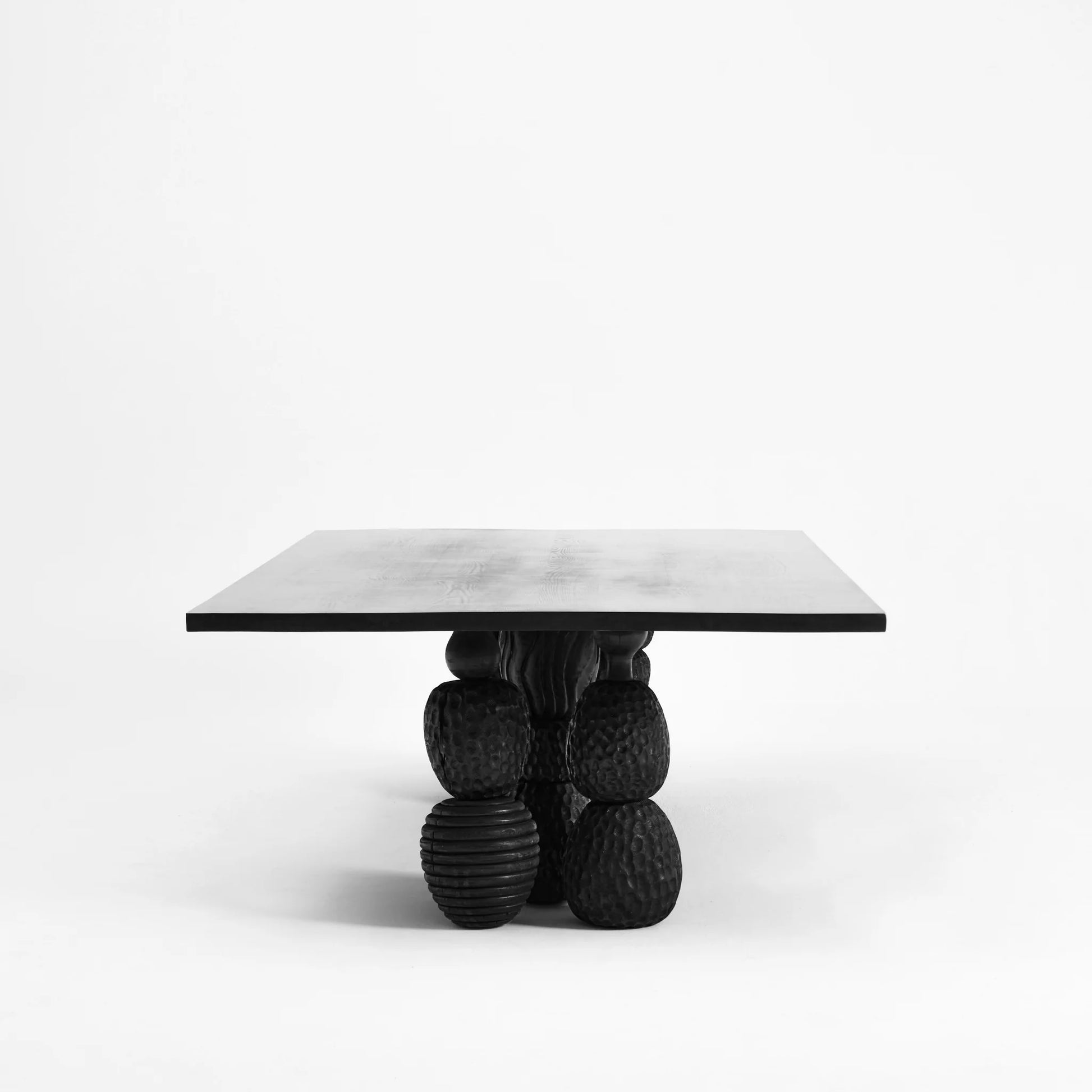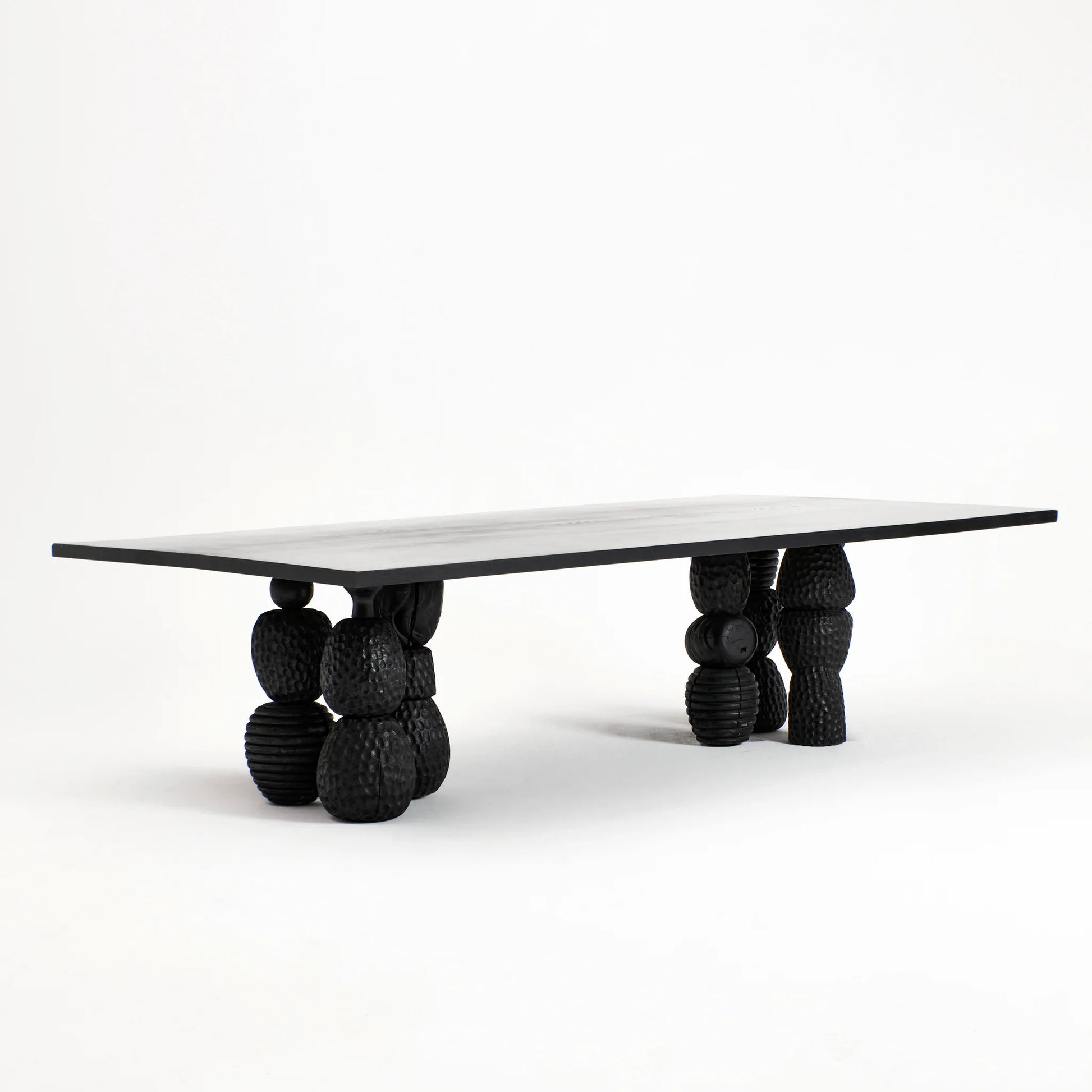 This dining table is crafted from Solid Black Varnished Chestnut with 6 ornamental legs. Each leg is formed of different hand-carved stacked pieces with different textures.