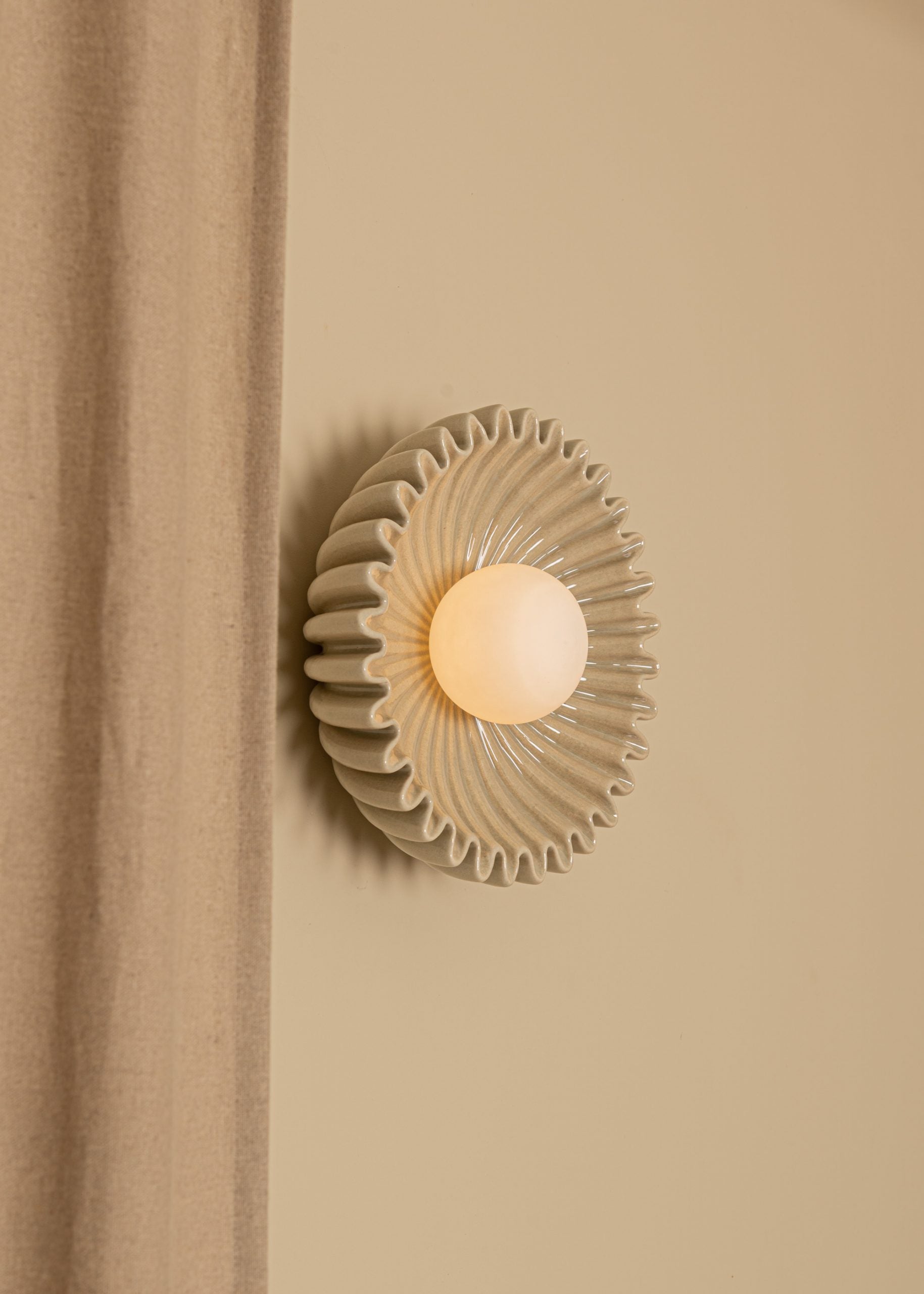 An outstanding piece made of a detailed ceramic shell, nesting a glass globe at its center, difusing a soft milky light. Both functional and sculptural, the Ostro wall light is unique and it is as beautiful alone or in pairs.